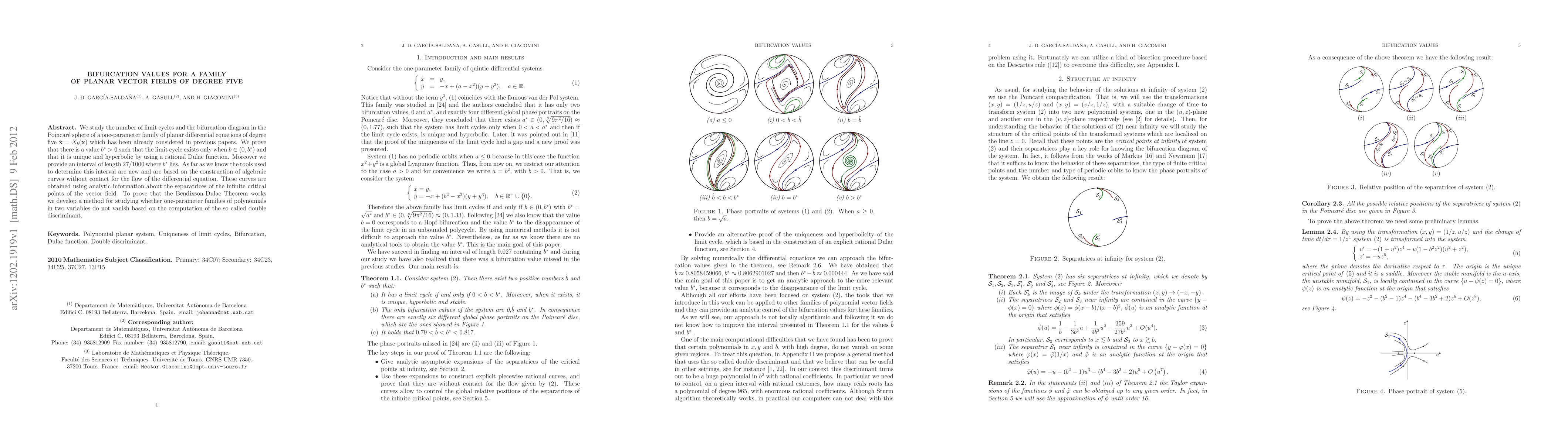 We study the number of limit cycles and the bifurcation diagram in the Poincar\'{e} sphere of a one-parameter family of planar differential equations of degree five $\dot {\bf x}=X_b({\bf x})$ which has been already considered in previous papers. We prove that there is a value $b^*>0$ such that the limit cycle exists only when $b\in(0,b^*)$ and that it is unique and hyperbolic by using a rational Dulac function. Moreover we provide an interval of length 27/1000 where $b^*$ lies. As far as we know the tools used to determine this interval are new and are based on the construction of algebraic curves without contact for the flow of the differential equation. These curves are obtained using analytic information about the separatrices of the infinite critical points of the vector field. To prove that the Bendixson-Dulac Theorem works we develop a method for studying whether one-parameter families of polynomials in two variables do not vanish based on the computation of the so called double discriminant.