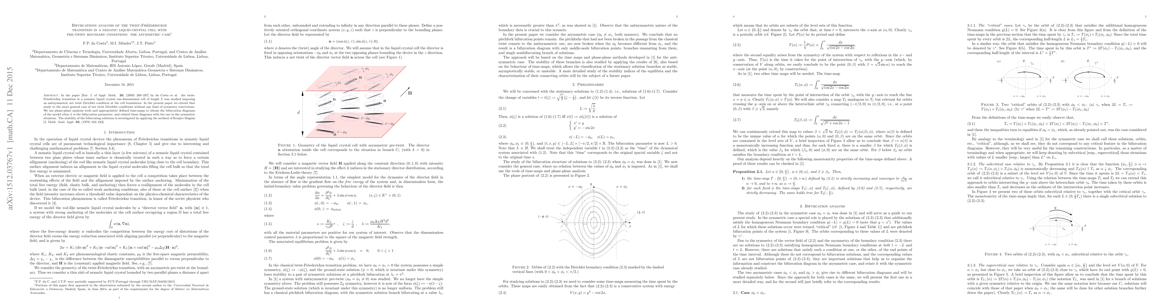 In the paper [Eur. J. of Appl. Math. \textbf{20}, (2009) 269--287] by da Costa et al. the twist-Fr\'eedericksz transition in a nematic liquid crystal one-dimensional cell of lenght $L$ was studied imposing an antisymmetric net twist Dirichlet condition at the cell boundaries. In the present paper we extend that study to the more general case of net twist Dirichlet conditions without any kind of symmetry restrictions. We use phase-plane analysis tools and appropriately defined time-maps to obtain the bifurcation diagrams of the model when $L$ is the bifurcation parameter, and related these diagrams with the one in the symmetric situation. The stability of the bifurcating solutions is investigated by applying the method of Kenjiro Maginu [J. Math. Anal. Appl. \textbf{63}, (1978) 224--243].