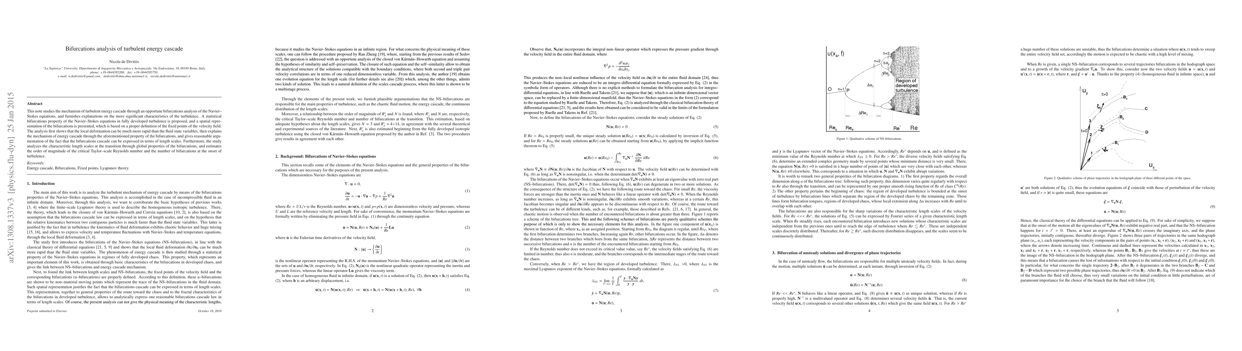 This paper analyzes the turbulent energy cascade via bifurcations in the Navier-Stokes equations, proposing a statistical bifurcations property and spatial representation based on fixed points of the velocity field. It estimates critical length scales and the critical Reynolds number at the onset of turbulence, providing insights into the rapid local deformations and energy cascade mechanisms.