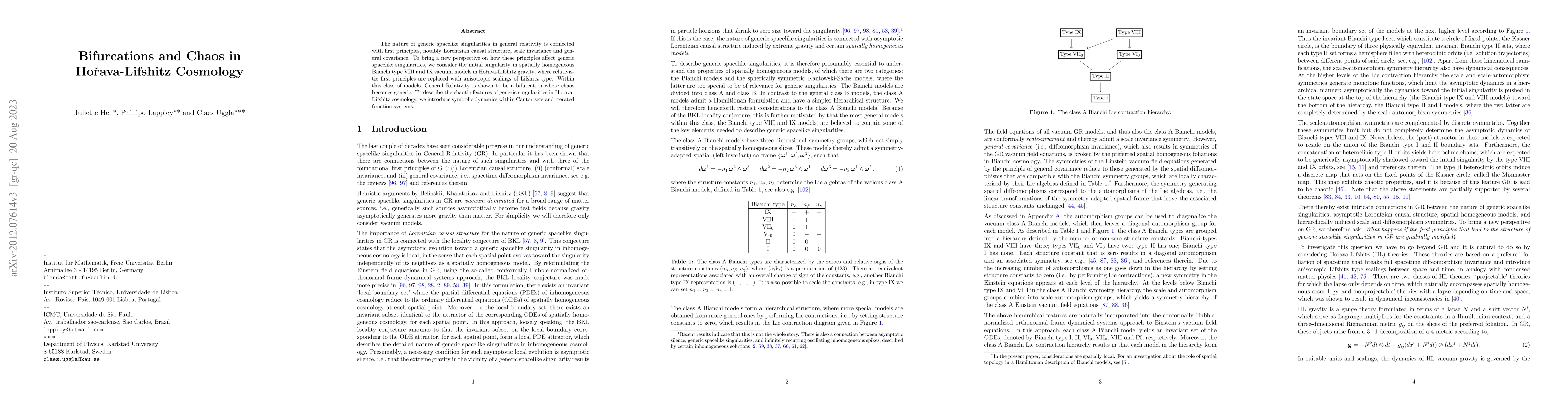The nature of generic spacelike singularities in general relativity is connected with first principles, notably Lorentzian causal structure, scale invariance and general covariance. To bring a new perspective on how these principles affect generic spacelike singularities, we consider the initial singularity in spatially homogeneous Bianchi type VIII and IX vacuum models in Ho\v{r}ava-Lifshitz gravity, where relativistic first principles are replaced with anisotropic scalings of Lifshitz type. Within this class of models, General Relativity is shown to be a bifurcation where chaos becomes generic. To describe the chaotic features of generic singularities in Ho\v{r}ava-Lifshitz cosmology, we introduce symbolic dynamics within Cantor sets and iterated function systems.