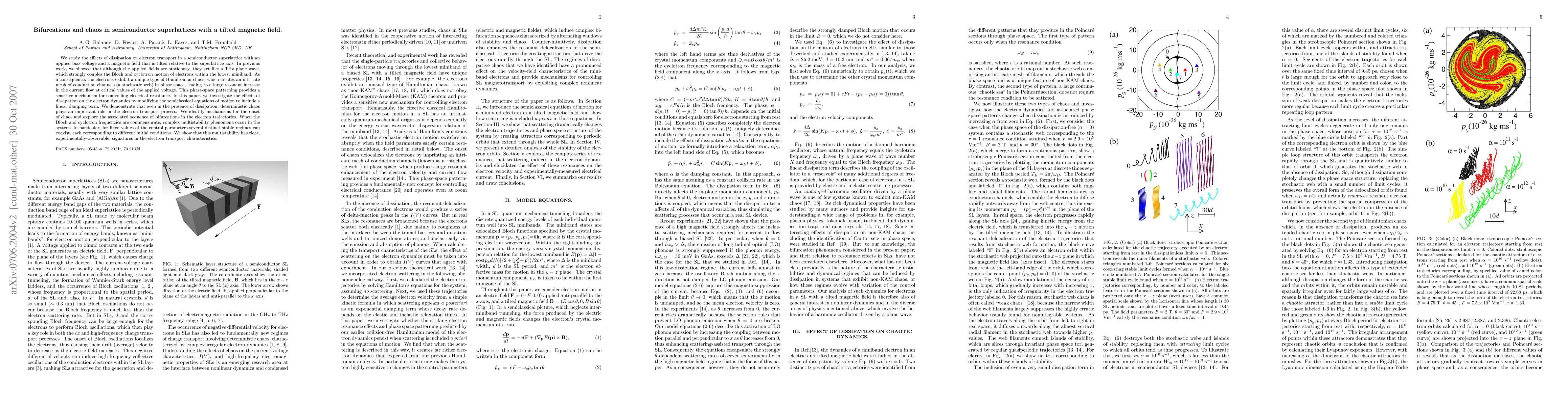 We study the effects of dissipation on electron transport in a semiconductor superlattice with an applied bias voltage and a magnetic field that is tilted relative to the superlattice axis.In previous work, we showed that although the applied fields are stationary,they act like a THz plane wave, which strongly couples the Bloch and cyclotron motion of electrons within the lowest miniband. As a consequence,the electrons exhibit a unique type of Hamiltonian chaos, which creates an intricate mesh of conduction channels (a stochastic web) in phase space, leading to a large resonant increase in the current flow at critical values of the applied voltage. This phase-space patterning provides a sensitive mechanism for controlling electrical resistance. In this paper, we investigate the effects of dissipation on the electron dynamics by modifying the semiclassical equations of motion to include a linear damping term. We demonstrate that even in the presence of dissipation,deterministic chaos plays an important role in the electron transport process. We identify mechanisms for the onset of chaos and explore the associated sequence of bifurcations in the electron trajectories. When the Bloch and cyclotron frequencies are commensurate, complex multistability phenomena occur in the system. In particular, for fixed values of the control parameters several distinct stable regimes can coexist, each corresponding to different initial conditions. We show that this multistability has clear, experimentally-observable, signatures in the electron transport characteristics.