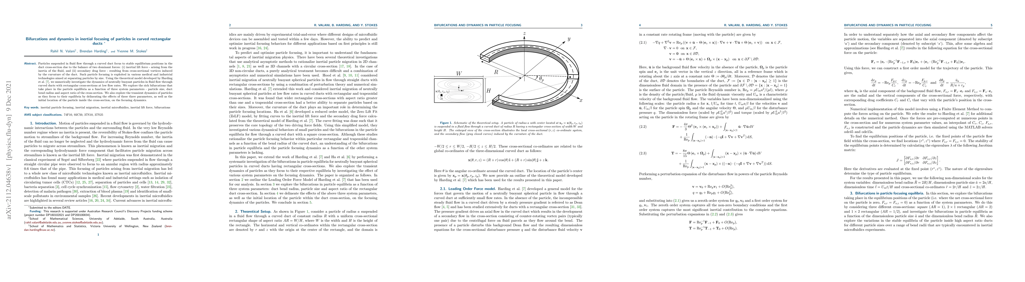 This paper investigates the dynamics and bifurcations of neutrally buoyant particles focusing in fluid flow through curved rectangular ducts, driven by inertial lift and secondary drag forces. It explores the effects of particle size, duct bend radius, and cross-section aspect ratio on both equilibrium positions and transient focusing dynamics.