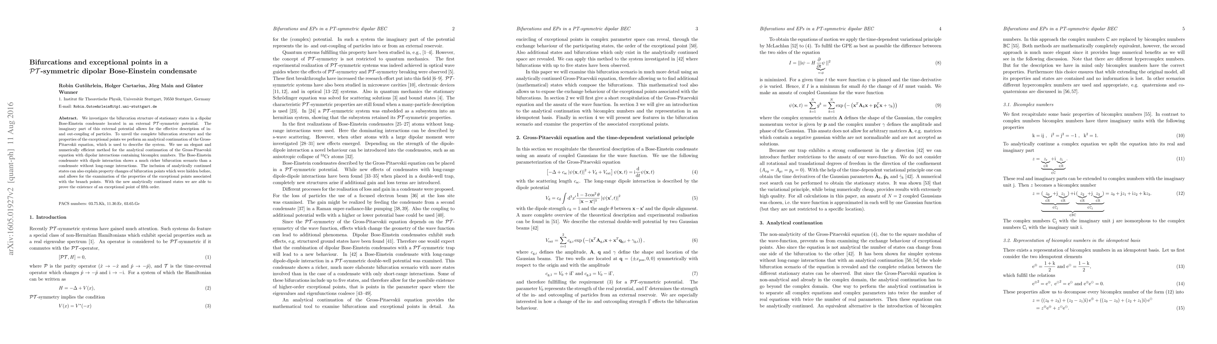 This paper explores the bifurcation structure of a dipolar Bose-Einstein condensate in a PT-symmetric potential, revealing a complex bifurcation scenario due to dipolar interactions. The authors employ an analytical continuation of the Gross-Pitaevskii equation to uncover the properties of exceptional points, including the first-ever proof of a fifth-order exceptional point.
