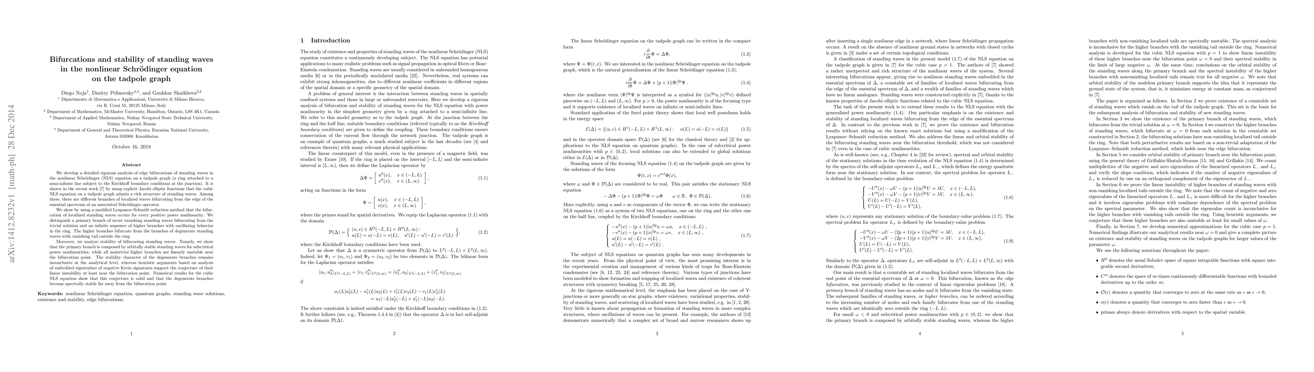 This paper rigorously analyzes edge bifurcations of standing waves in the cubic nonlinear Schrödinger equation on a tadpole graph, revealing multiple branches of localized waves. The primary branch is shown to be orbitally stable for subcritical nonlinearities, while higher branches are linearly unstable near the bifurcation point, with numerical results supporting the conjecture of their instability.