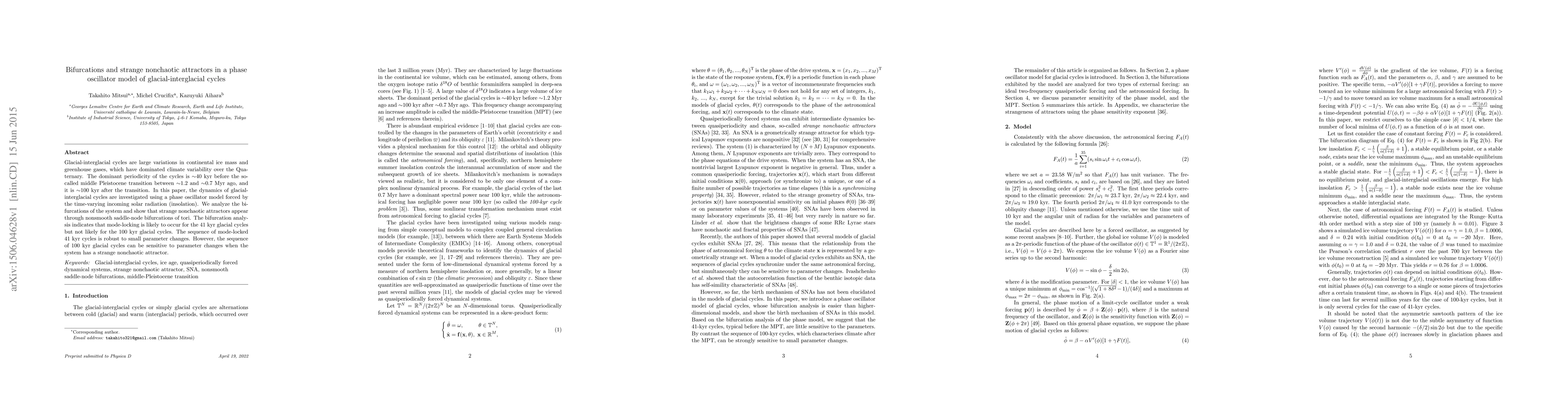 This paper explores the dynamics of glacial-interglacial cycles using a phase oscillator model driven by insolation. It reveals bifurcations leading to strange nonchaotic attractors, indicating robust 41 kyr cycles but sensitivity in 100 kyr cycles to parameter changes.