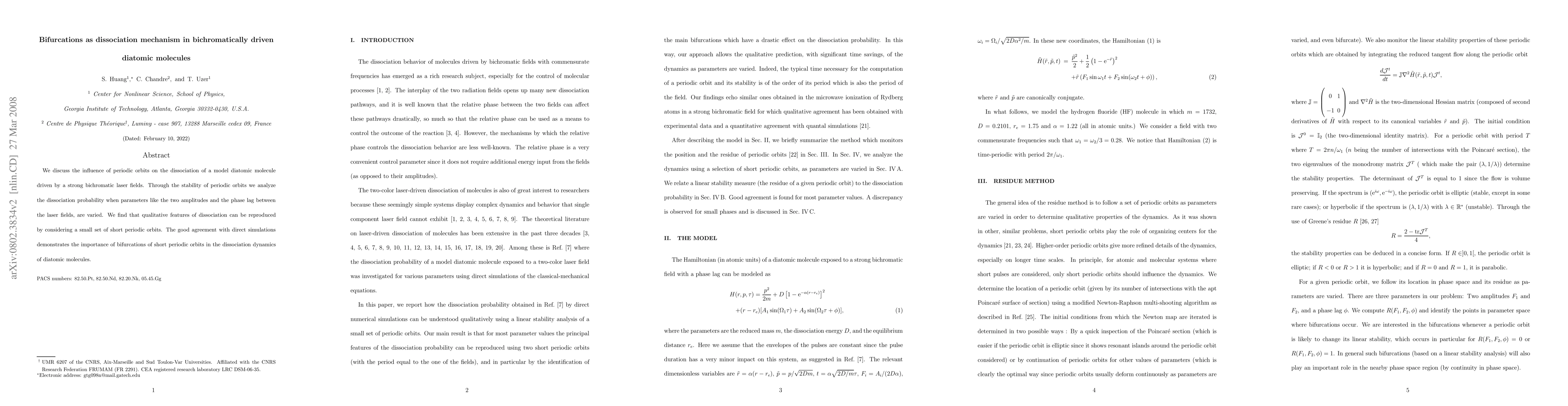 This paper investigates how periodic orbits influence the dissociation of diatomic molecules under strong bichromatic laser fields, finding that bifurcations of short periodic orbits play a crucial role in determining dissociation probability, validated by direct simulations.