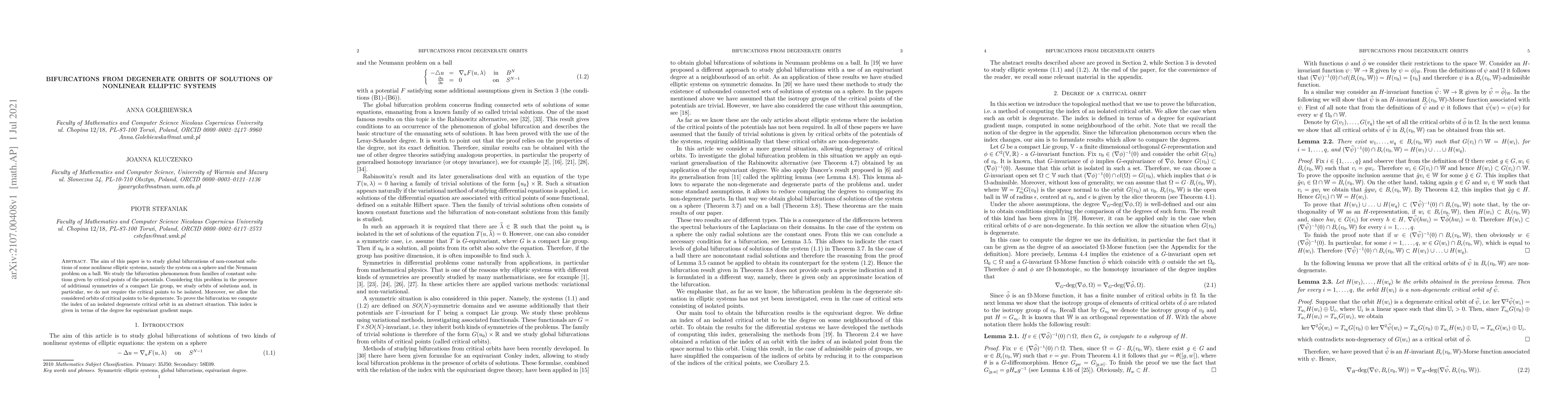 The aim of this paper is to study global bifurcations of non-constant solutions of some nonlinear elliptic systems, namely the system on a sphere and the Neumann problem on a ball. We study the bifurcation phenomenon from families of constant solutions given by critical points of the potentials. Considering this problem in the presence of additional symmetries of a compact Lie group, we study orbits of solutions and, in particular, we do not require the critical points to be isolated. Moreover, we allow the considered orbits of critical points to be degenerate. To prove the bifurcation we compute the index of an isolated degenerate critical orbit in an abstract situation. This index is given in terms of the degree for equivariant gradient maps.