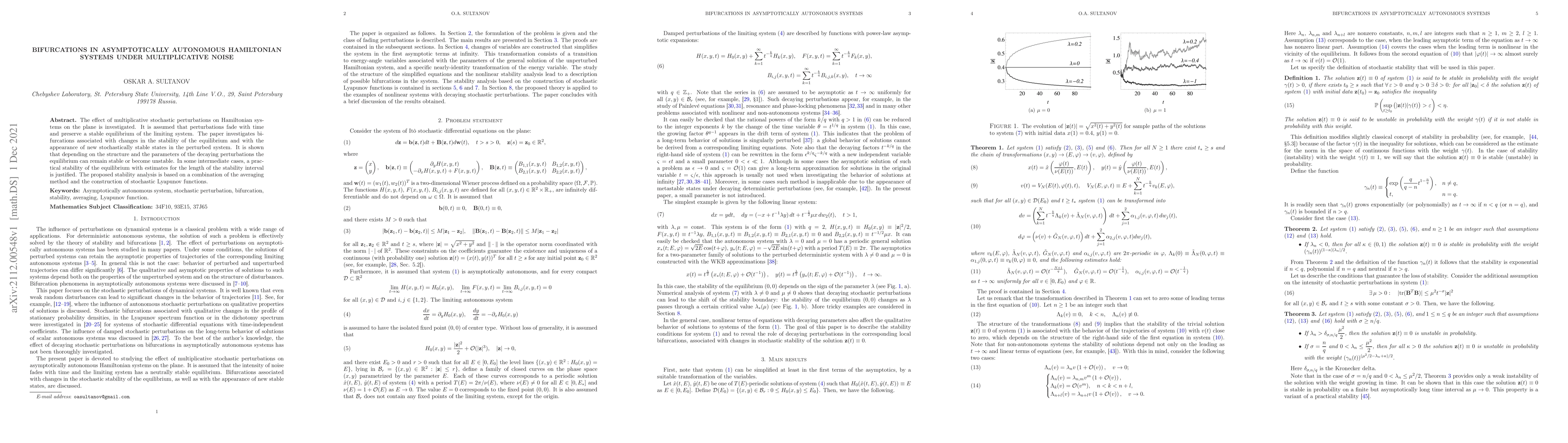 This paper examines how multiplicative noise affects asymptotically autonomous Hamiltonian systems, focusing on bifurcations that alter equilibrium stability or introduce new stochastically stable states. The study combines averaging methods and stochastic Lyapunov functions to analyze stability, revealing scenarios where equilibria remain stable, become unstable, or exhibit practical stability.