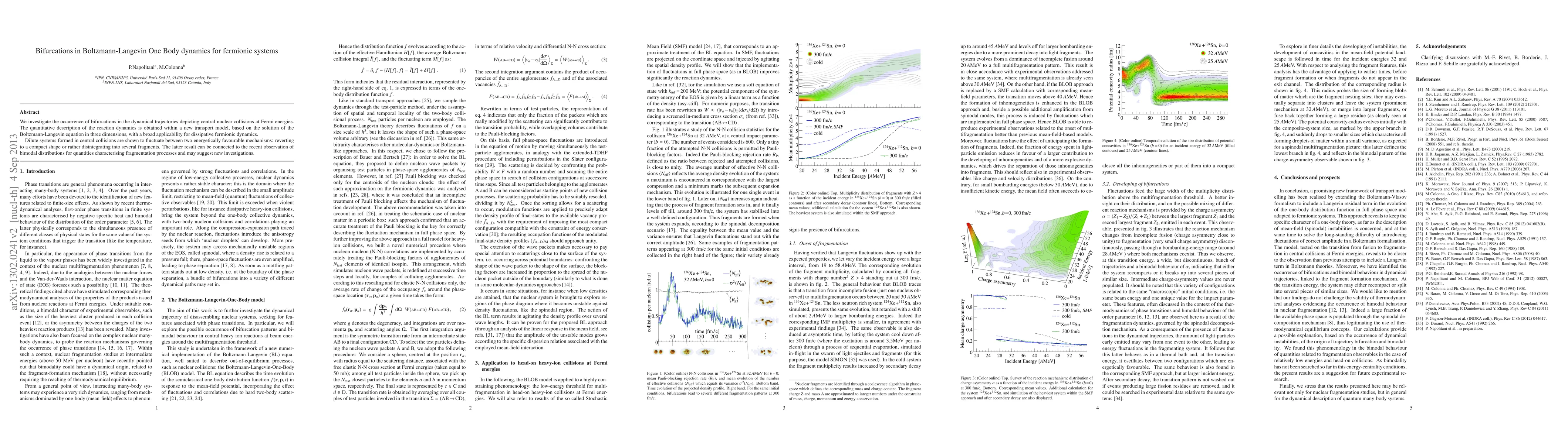 This paper explores bifurcations in the dynamics of central nuclear collisions at Fermi energies using a new transport model based on the Boltzmann-Langevin equation. The study reveals that dilute systems formed in these collisions fluctuate between reverting to a compact shape or disintegrating into fragments, linking to recent bimodal fragmentation observations.