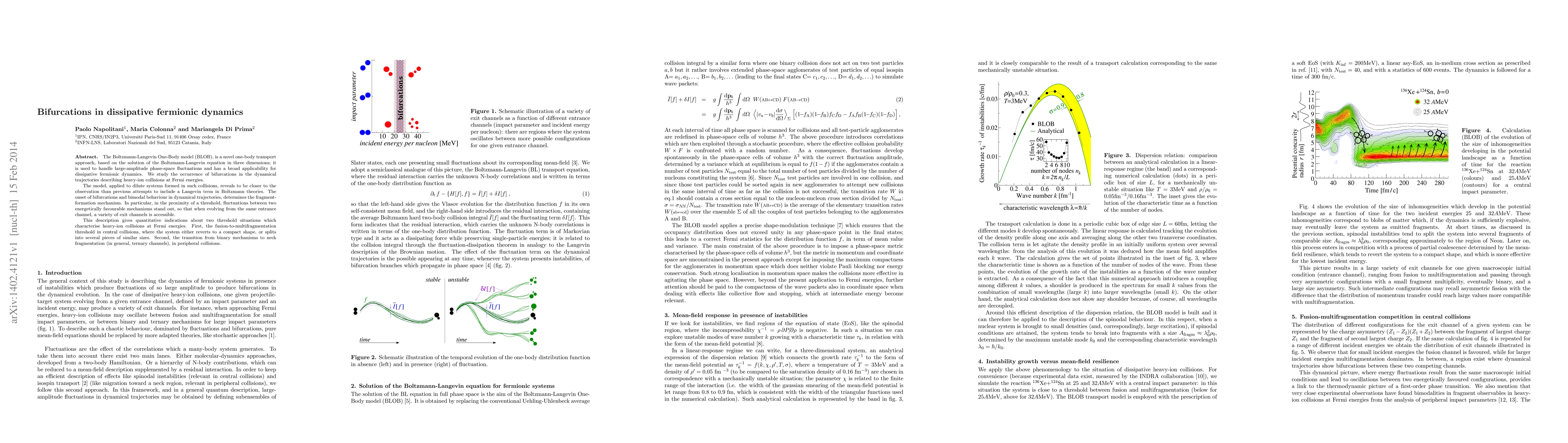 This paper investigates bifurcations in dissipative fermionic dynamics using the Boltzmann-Langevin One-Body model (BLOB), revealing two critical transition points in heavy-ion collisions at Fermi energies: fusion-to-multifragmentation and the shift from binary to ternary fragmentation mechanisms.