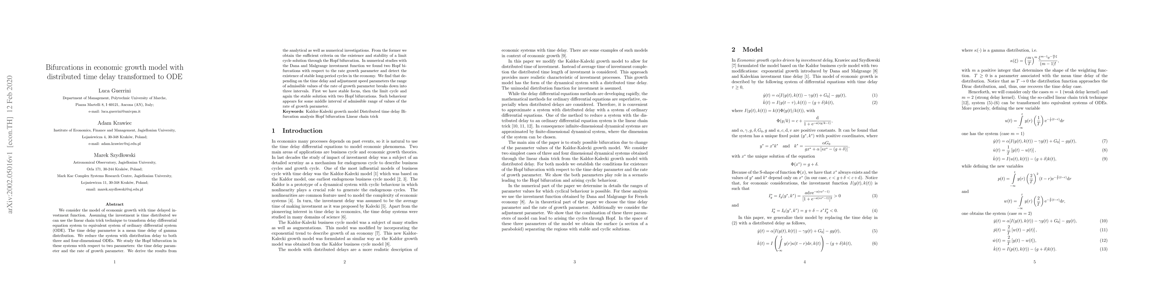 This study investigates how time delays in economic growth models affect stability and cycles, finding three intervals of admissible rate of growth parameters that lead to stable focus, limit cycle, or stable solution with two Hopf bifurcations.