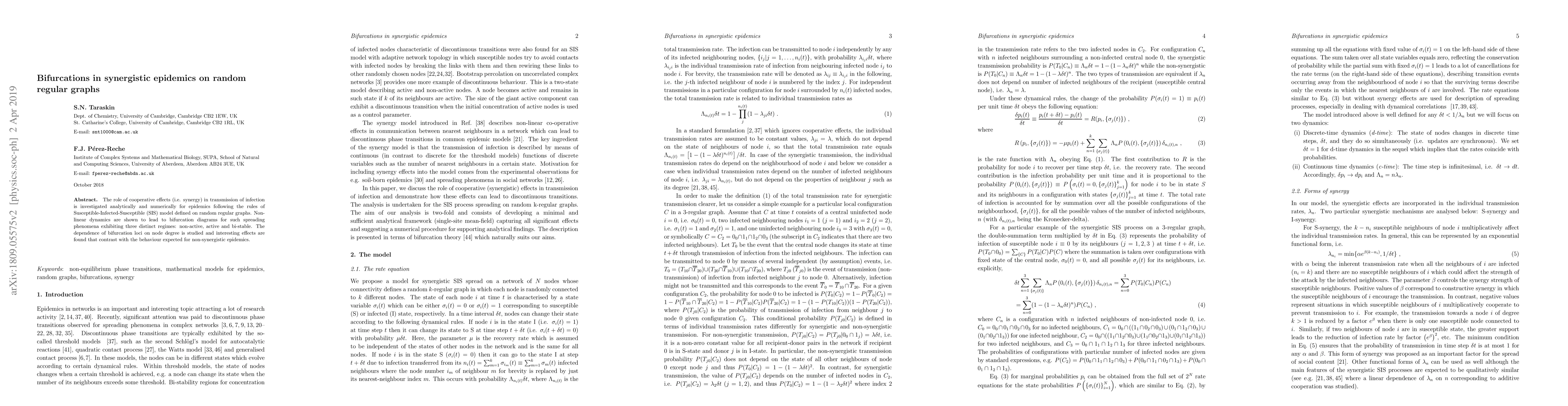 The role of cooperative effects (i.e. synergy) in transmission of infection is investigated analytically and numerically for epidemics following the rules of Susceptible-Infected-Susceptible (SIS) model defined on random regular graphs. Non-linear dynamics are shown to lead to bifurcation diagrams for such spreading phenomena exhibiting three distinct regimes: non-active, active and bi-stable. The dependence of bifurcation loci on node degree is studied and interesting effects are found that contrast with the behaviour expected for non-synergistic epidemics.
