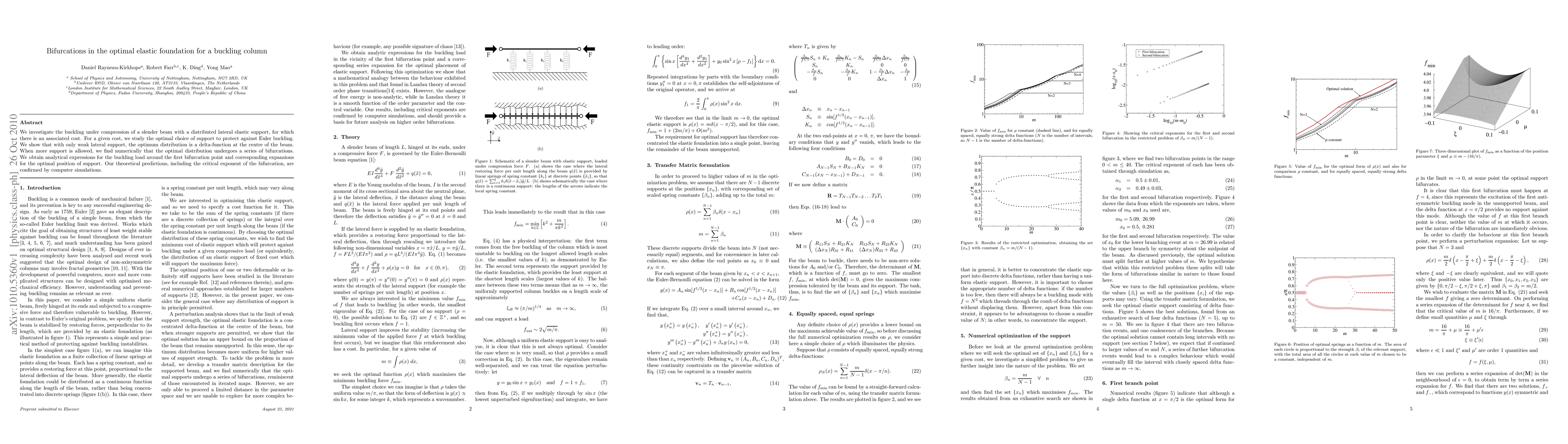 This paper studies the optimal elastic foundation for a buckling column under compression, revealing that weak support leads to a delta-function optimum at the center. With increased support, the optimal distribution bifurcates, and analytical expressions for the buckling load and support position around the first bifurcation are derived and validated by simulations.