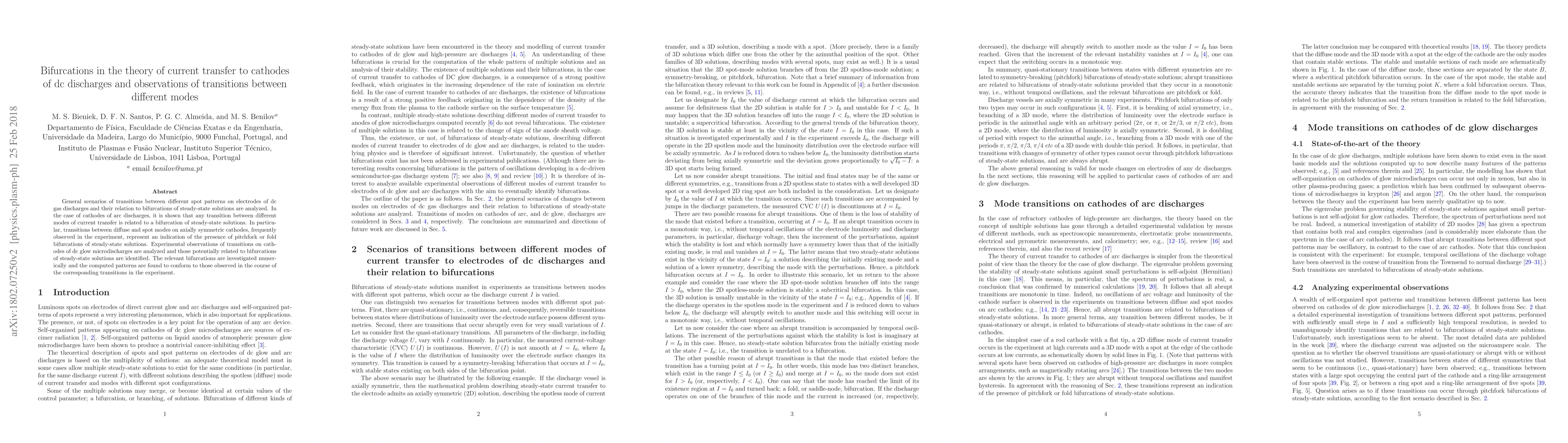 The paper analyzes transitions in dc discharge modes on cathodes, linking them to steady-state solution bifurcations. It identifies pitchfork or fold bifurcations in axially symmetric cathode diffuse-spot mode transitions, supported by numerical investigations and experimental observations in both arc and glow microdischarges.