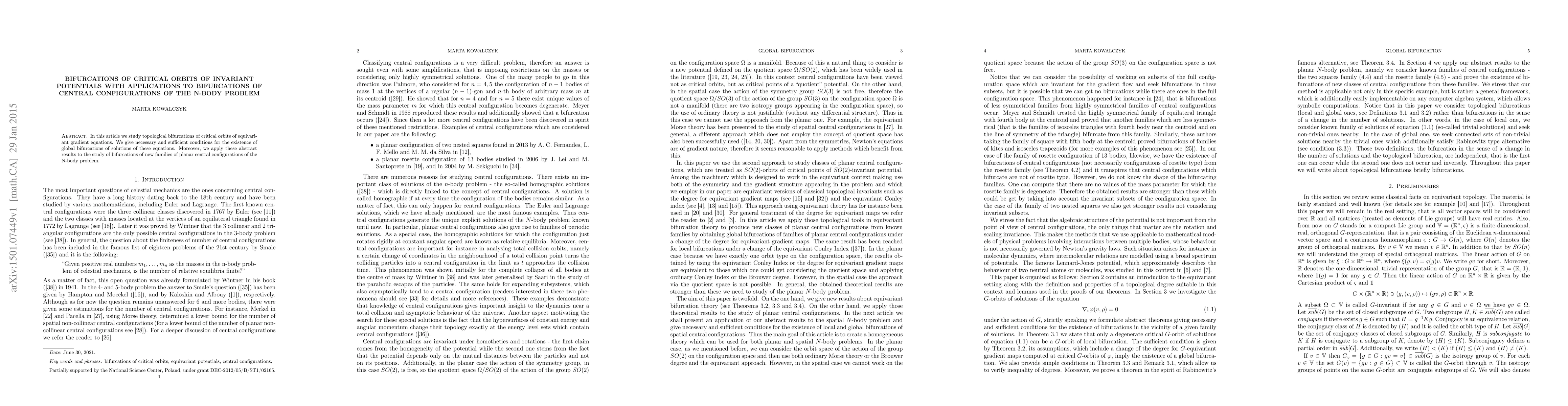 This research paper studies bifurcations of critical orbits in mathematical equations with applications to the N-body problem, providing conditions for global bifurcations and new insights into central configurations.