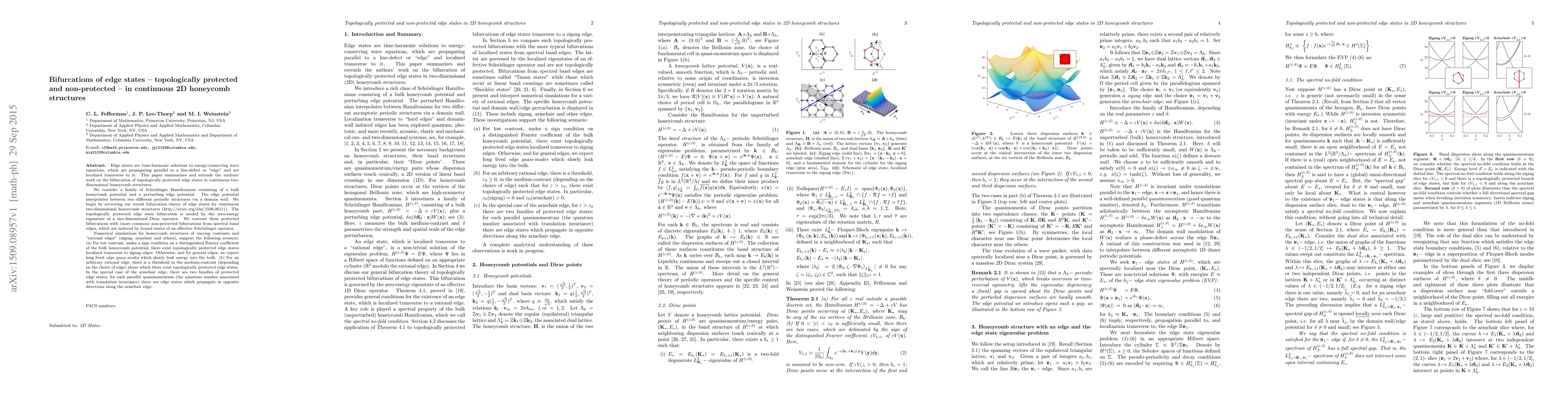 This paper summarizes and extends the authors' work on the bifurcation of topologically protected edge states in continuous two-dimensional honeycomb structures. We consider a family of Schr\"odinger Hamiltonians consisting of a bulk honeycomb potential and a perturbing edge potential. The edge potential interpolates between two different periodic structures via a domain wall. We begin by reviewing our recent bifurcation theory of edge states for continuous two-dimensional honeycomb structures. The topologically protected bifurcation of edge states is seeded by the zero-energy eigenstate of a one-dimensional Dirac operator. We contrast these protected bifurcations with (more common) non-protected bifurcations from spectral band edges, which are induced by bound states of an effective Schr\"odinger operator. Numerical simulations for honeycomb structures of varying contrasts and "rational edges" (zigzag, armchair and others), support the following scenario: (a) For low contrast, under a sign condition on a distinguished Fourier coefficient of the bulk honeycomb potential, there exist topologically protected edge states localized transverse to zigzag edges. Otherwise, and for general edges, we expect long lived {\it edge quasi-modes} which slowly leak energy into the bulk. (b) For an arbitrary rational edge, there is a threshold in the medium-contrast (depending on the choice of edge) above which there exist topologically protected edge states. In the special case of the armchair edge, there are two families of protected edge states; for each parallel quasimomentum (the quantum number associated with translation invariance) there are edge states which propagate in opposite directions along the armchair edge.