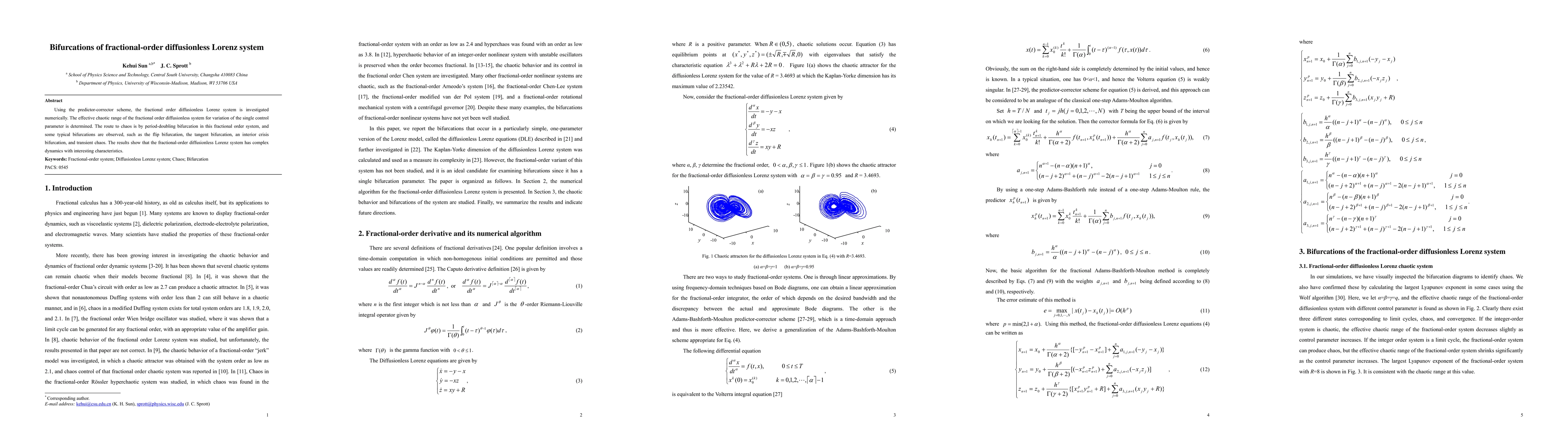 This paper numerically investigates the fractional-order diffusionless Lorenz system using the predictor-corrector scheme, revealing complex dynamics and chaotic behavior through period-doubling bifurcations. Various bifurcations, including flip, tangent, interior crisis, and transient chaos, are observed, highlighting the system's intricate dynamic range.
