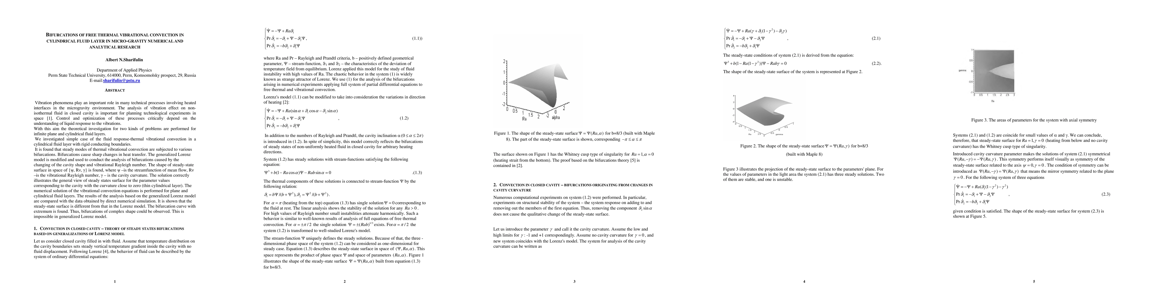 The analysis of vibration effect on non-isothermal fluid in closed cavity is important for planning technological experiments in space. Control and optimization of these processes critically depend on the understanding of liquid response to the vibrations. With this aim the theoretical investigation for infinite plane and cylindrical fluid layers are performed. We investigated simple case of the fluid response-thermal vibrational convection in a cylindrical fluid layer with rigid conducting boundaries. It is found that steady modes of thermal vibrational convection are subjected to various bifurcations. Bifurcations cause sharp changes in heat transfer. The Lorenz model is generalized (GLM) and used to conduct the analysis of bifurcations caused by the changing of the cavity shape and vibrational Rayleigh number. The shape of steady-state surface in 3D space of the streamfunction of mean flow, vibrational Rayleigh number and the cavity curvature is found. The numerical 2D solution is performed for plane and cylindrical fluid layers. The results of the analysis based on the GLM model are compared with the data obtained by direct numerical simulation. The bifurcation curve with extremum is found. Thus, bifurcations of complex shape could be observed. Comparisons with space experiments and its discussions are presented.