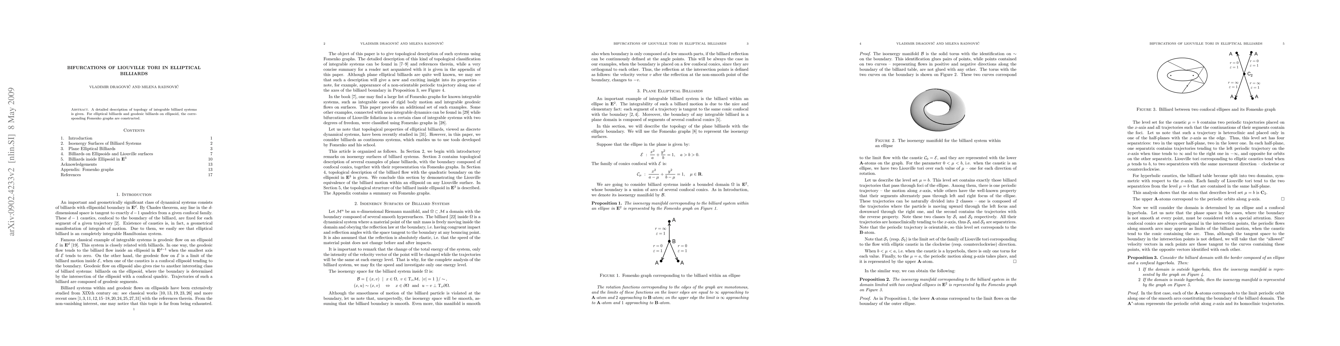 Summary: This paper explores the topology of integrable billiard systems, specifically focusing on elliptical billiards and geodesic billiards on ellipsoids, and constructs corresponding Fomenko graphs to detail the bifurcations of Liouville tori.