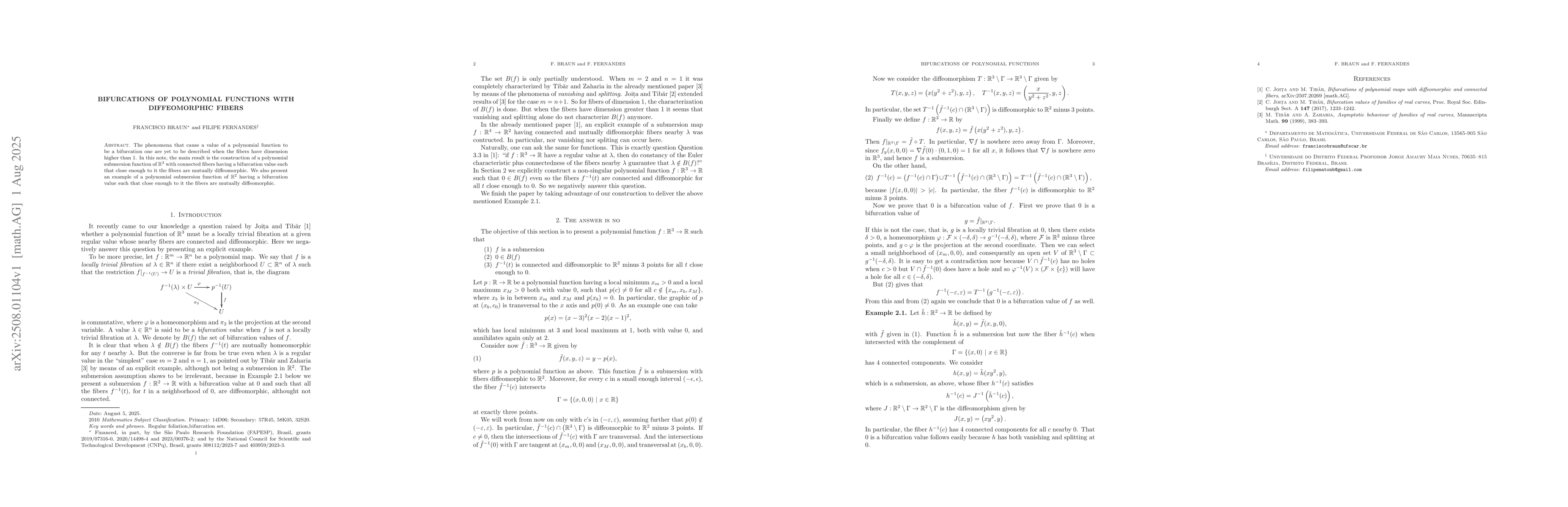 The phenomena that cause a value of a polynomial function to be a bifurcation one are yet to be described when the fibers have dimension higher than $1$. In this note, the main result is the construction of a polynomial submersion function of $\mathbb{R}^3$ with connected fibers having a bifurcation value such that close enough to it the fibers are mutually diffeomorphic. We also present an example of a polynomial submersion function of $\mathbb{R}^2$ having a bifurcation value such that close enough to it the fibers are mutually diffeomorphic.