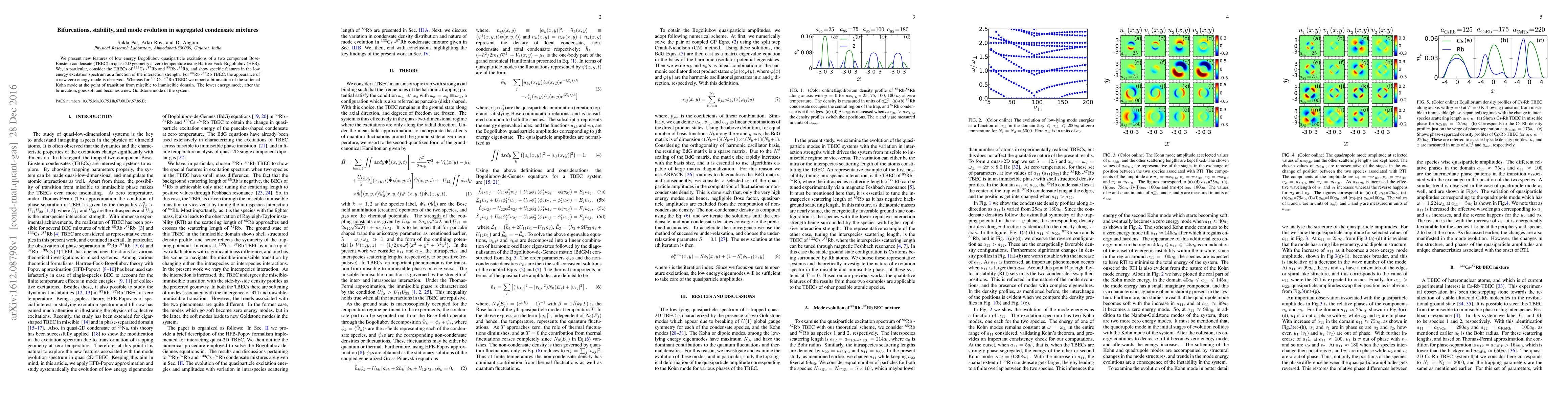 We present new features of low energy Bogoliubov quasiparticle excitations of a two component Bose-Einstein condensate (TBEC) in quasi-2D geometry at zero temperature using Hartree-Fock-Bogoliubov (HFB). We, in particular, consider the TBECs of $^{133}$Cs~-$^{87}$Rb and $^{85}$Rb~-$^{87}$Rb, and show specific features in the low energy excitation spectrum as a function of the interaction strength. For $^{85}$Rb~-$^{87}$Rb TBEC, the appearance of a new zero energy mode is observed. Whereas for $^{133}$Cs~-$^{87}$Rb TBEC we report a bifurcation of the softened Kohn mode at the point of transition from miscible to immiscible domain. The lower energy mode, after the bifurcation, goes soft and becomes a new Goldstone mode of the system.