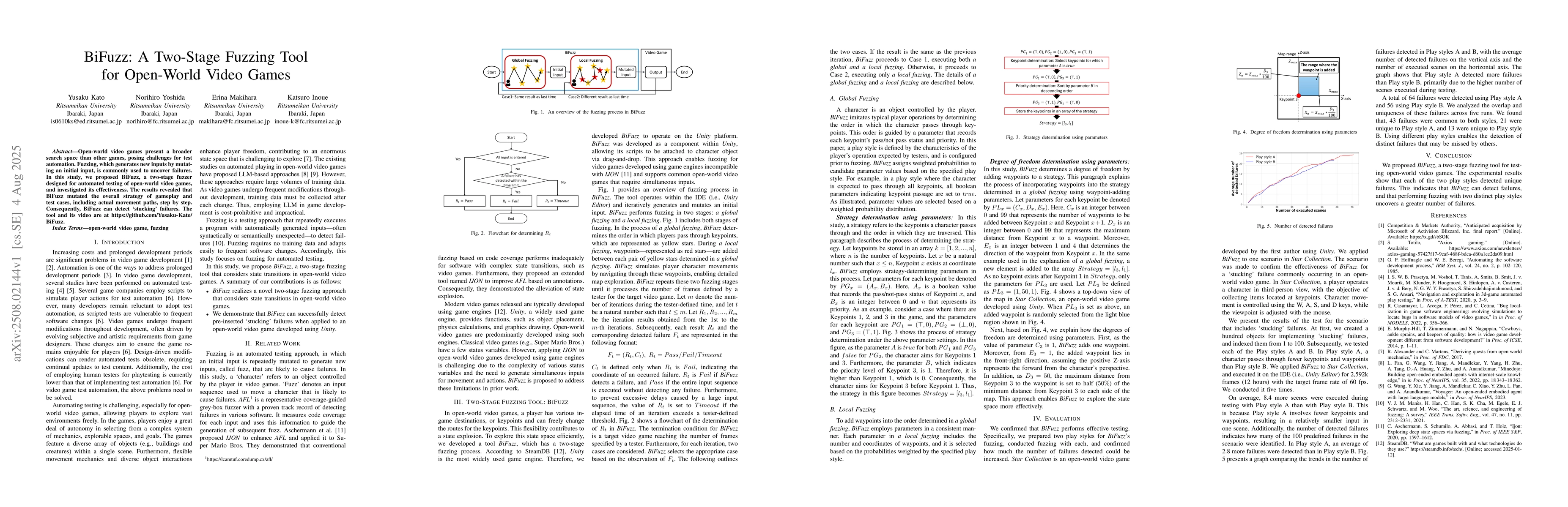 Open-world video games present a broader search space than other games, posing challenges for test automation. Fuzzing, which generates new inputs by mutating an initial input, is commonly used to uncover failures. In this study, we proposed BiFuzz, a two-stage fuzzer designed for automated testing of open-world video games, and investigated its effectiveness. The results revealed that BiFuzz mutated the overall strategy of gameplay and test cases, including actual movement paths, step by step. Consequently, BiFuzz can detect `stucking' failures. The tool and its video are at https://github.com/Yusaku-Kato/BiFuzz.
