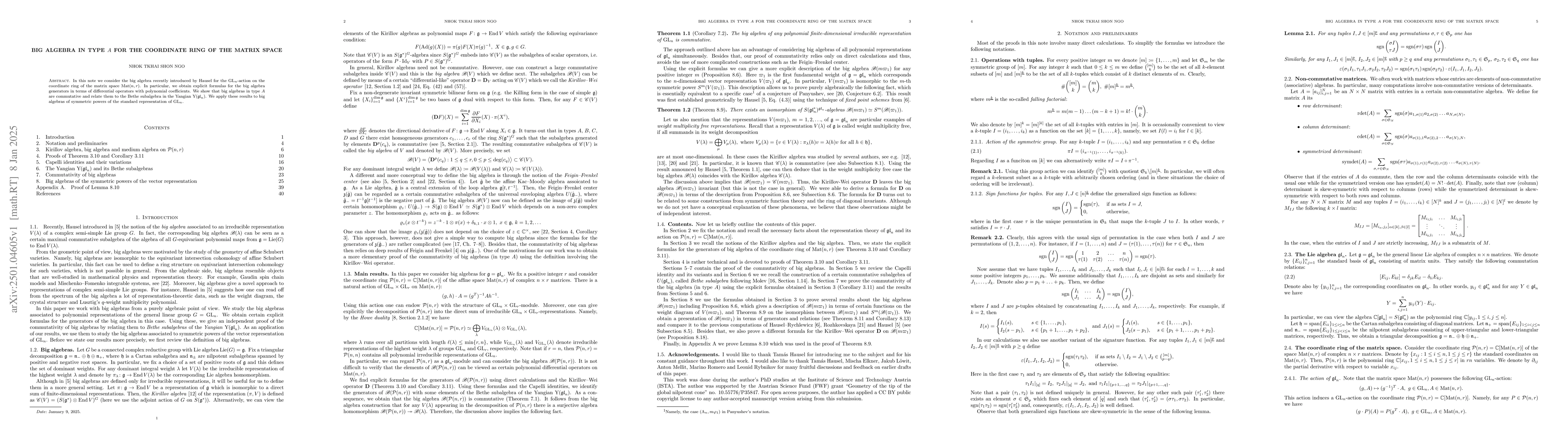 This paper explores Hausel's big algebra for the $\mathrm{GL}_n$-action on the matrix space $\operatorname{Mat}(n,r)$, deriving explicit formulas for its generators as polynomial differential operators. It establishes that big algebras in type $A$ are commutative and connects them to the Bethe subalgebra in the Yangian $\mathrm{Y}(\mathfrak{gl}_{n})$.