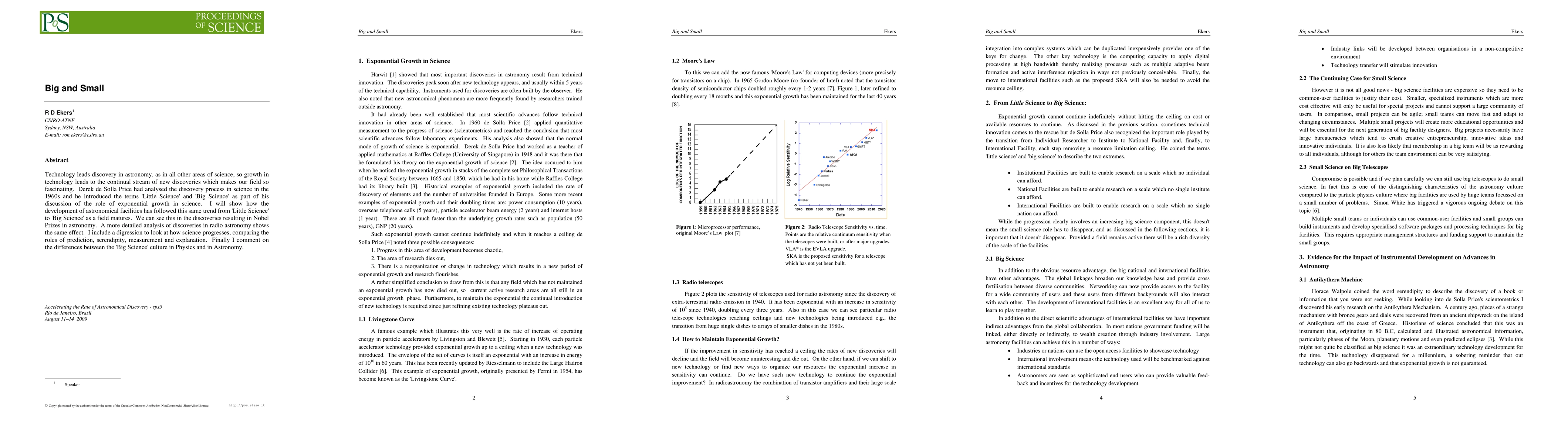 Technology leads discovery in astronomy, as in all other areas of science, so growth in technology leads to the continual stream of new discoveries which makes our field so fascinating. Derek de Solla Price had analysed the discovery process in science in the 1960s and he introduced the terms 'Little Science' and 'Big Science' as part of his discussion of the role of exponential growth in science. I will show how the development of astronomical facilities has followed this same trend from 'Little Science' to 'Big Science' as a field matures. We can see this in the discoveries resulting in Nobel Prizes in astronomy. A more detailed analysis of discoveries in radio astronomy shows the same effect. I include a digression to look at how science progresses, comparing the roles of prediction, serendipity, measurement and explanation. Finally I comment on the differences between the 'Big Science' culture in Physics and in Astronomy.