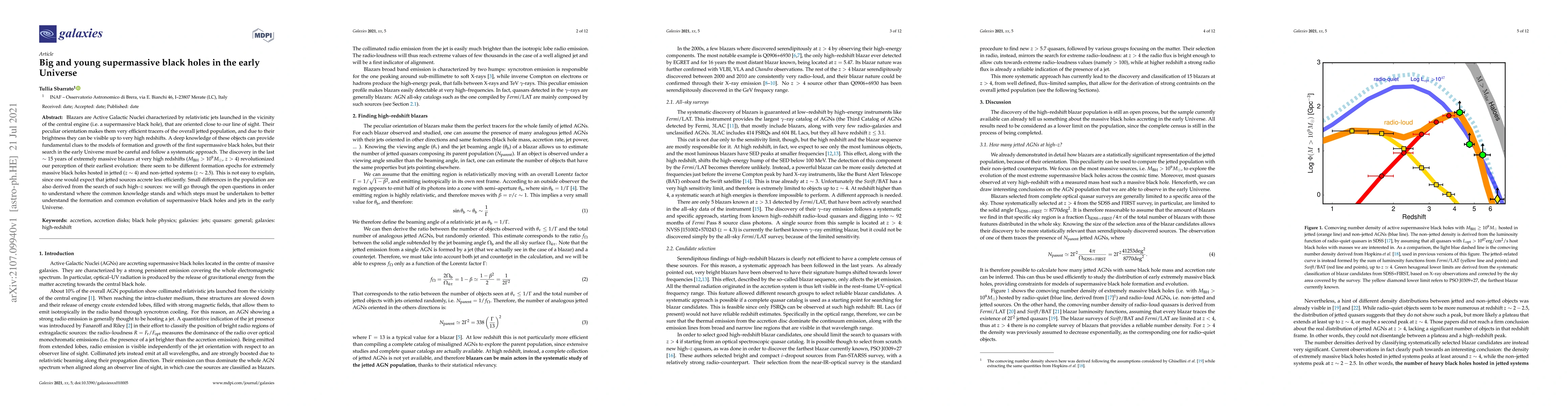 This paper investigates the formation and growth of supermassive black holes in the early Universe, focusing on blazars—bright, high-redshift AGNs with relativistic jets. It highlights the discovery of extremely massive blazars at high redshifts, suggesting different formation epochs for massive black holes in jetted versus non-jetted systems, challenging existing accretion models.