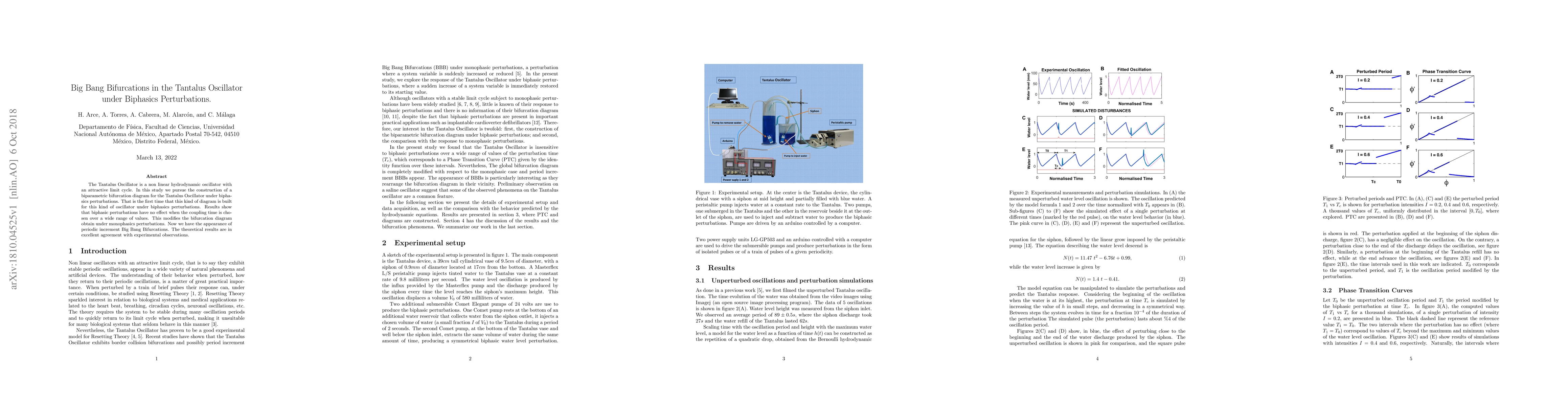 Researchers built a bifurcation diagram for the Tantalus Oscillator under biphasic perturbations, revealing periodic Big Bang Bifurcations that differ from monophasic results, with theoretical findings matching experimental observations.