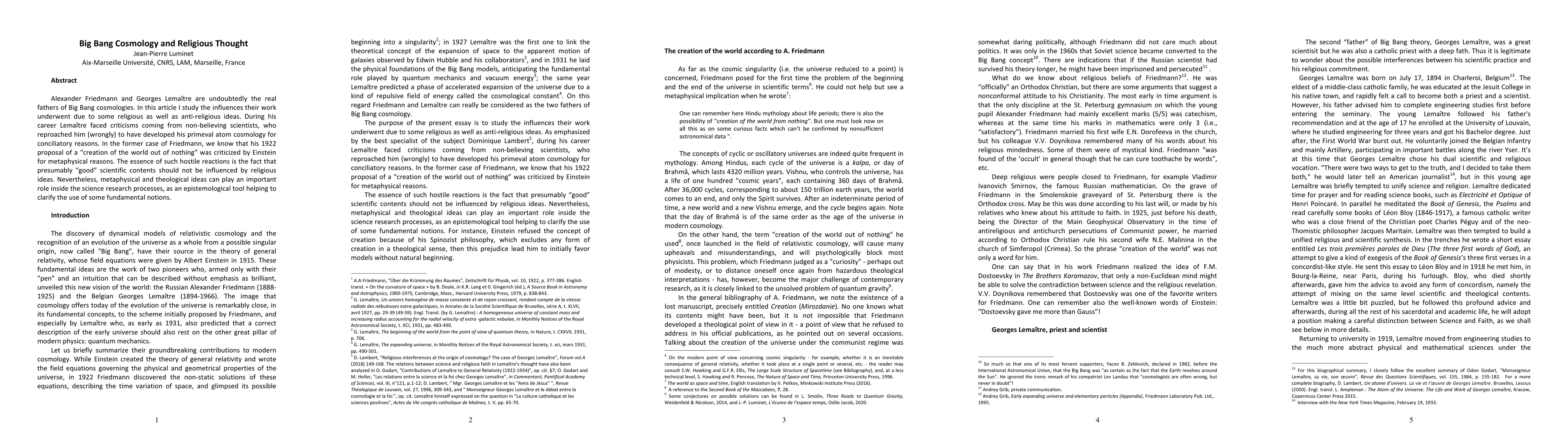 This paper examines the interplay between Big Bang cosmology and religious thought, focusing on the influences of religious and anti-religious ideas on the work of Alexander Friedmann and Georges Lemaître. It highlights how Lemaître faced criticism from non-believing scientists and how Einstein rejected Friedmann's ideas on metaphysical grounds, despite the potential epistemological value of theological concepts in scientific research.