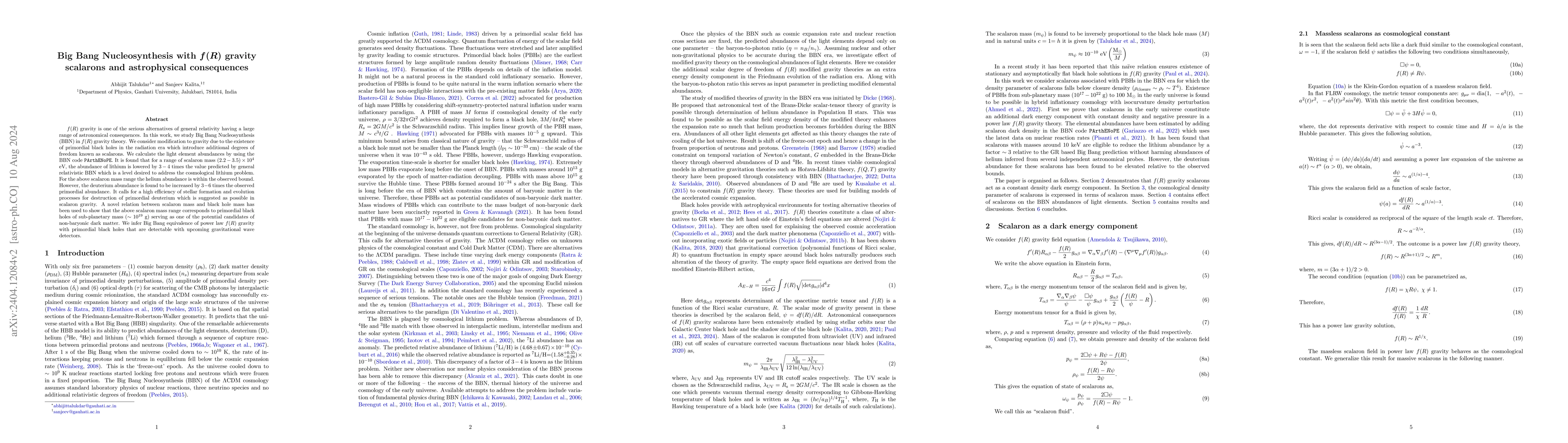 This research explores $f(R)$ gravity's impact on Big Bang Nucleosynthesis (BBN), finding that scalarons from primordial black holes can significantly reduce lithium abundance to resolve the cosmological lithium problem, while increasing deuterium abundance necessitates efficient stellar processes for deuterium destruction. It also suggests a correlation between scalaron mass and primordial black hole mass, identifying these black holes as potential dark matter candidates.