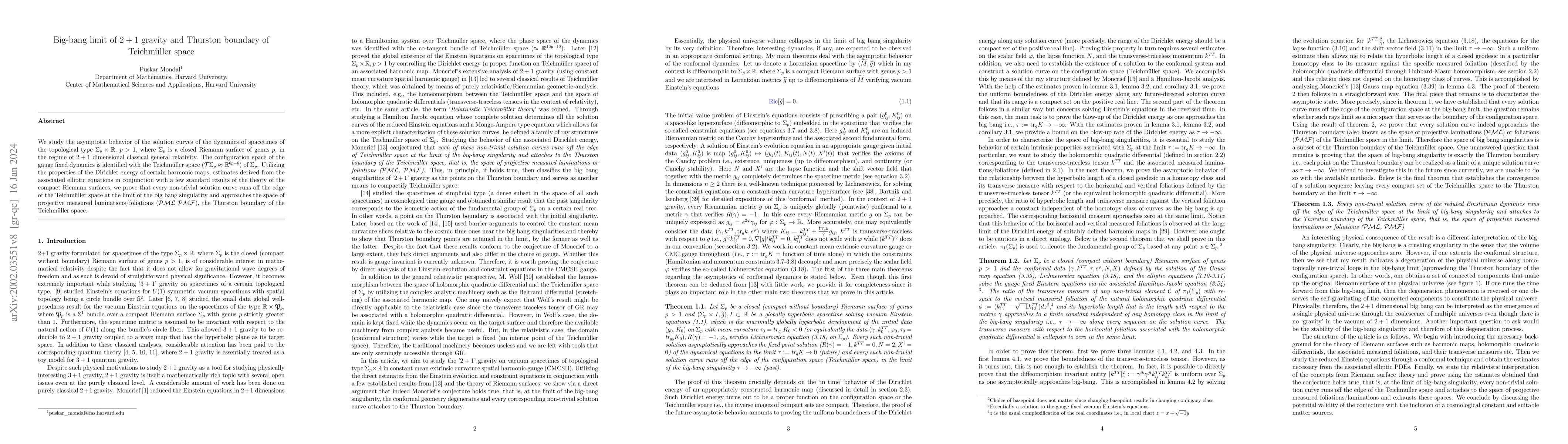 This paper investigates the asymptotic behavior of $2+1$ dimensional classical general relativity solutions, showing that non-trivial solutions approach the Thurston boundary of Teichmüller space, specifically the space of projective measured laminations/foliations, as they approach the big bang singularity. The study leverages Dirichlet energy and elliptic equations to derive these results.