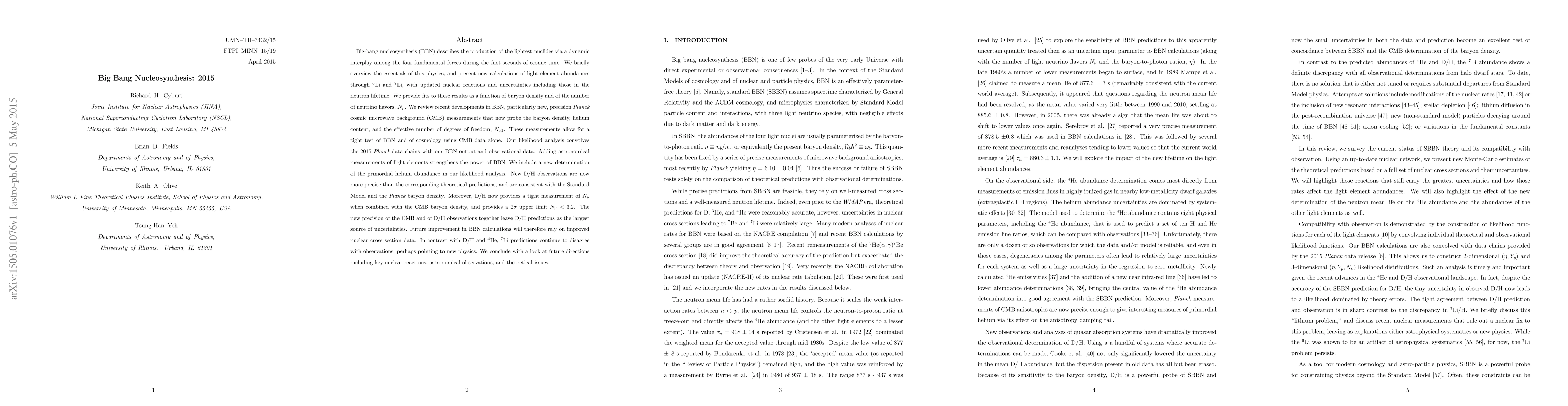 Big-bang nucleosynthesis (BBN) describes the production of the lightest nuclides via a dynamic interplay among the four fundamental forces during the first seconds of cosmic time. We briefly overview the essentials of this physics, and present new calculations of light element abundances through li6 and li7, with updated nuclear reactions and uncertainties including those in the neutron lifetime. We provide fits to these results as a function of baryon density and of the number of neutrino flavors, N_nu. We review recent developments in BBN, particularly new, precision Planck cosmic microwave background (CMB) measurements that now probe the baryon density, helium content, and the effective number of degrees of freedom, n_eff. These measurements allow for a tight test of BBN and of cosmology using CMB data alone. Our likelihood analysis convolves the 2015 Planck data chains with our BBN output and observational data. Adding astronomical measurements of light elements strengthens the power of BBN. We include a new determination of the primordial helium abundance in our likelihood analysis. New D/H observations are now more precise than the corresponding theoretical predictions, and are consistent with the Standard Model and the Planck baryon density. Moreover, D/H now provides a tight measurement of N_nu when combined with the CMB baryon density, and provides a 2sigma upper limit N_nu < 3.2. The new precision of the CMB and of D/H observations together leave D/H predictions as the largest source of uncertainties. Future improvement in BBN calculations will therefore rely on improved nuclear cross section data. In contrast with D/H and he4, li7 predictions continue to disagree with observations, perhaps pointing to new physics.