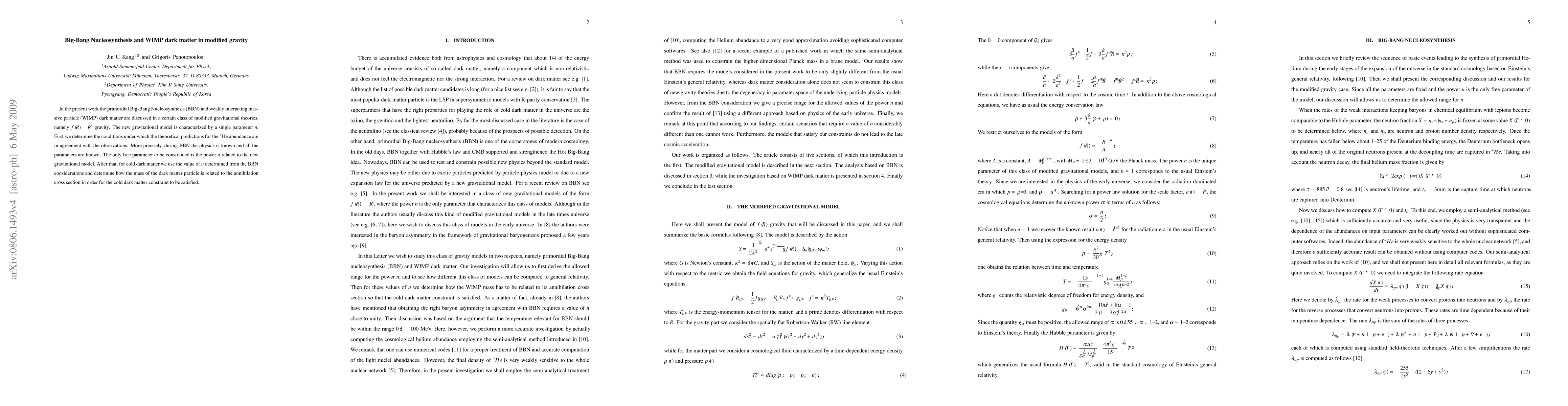 This paper explores the implications of modified gravity, specifically $f(R) \sim R^n$ gravity, on Big-Bang Nucleosynthesis (BBN) and weakly interacting massive particle (WIMP) dark matter. It determines the parameter $n$ that aligns the predicted $^{4}$He abundance with observations and uses this to assess the mass and annihilation cross section of WIMP dark matter.