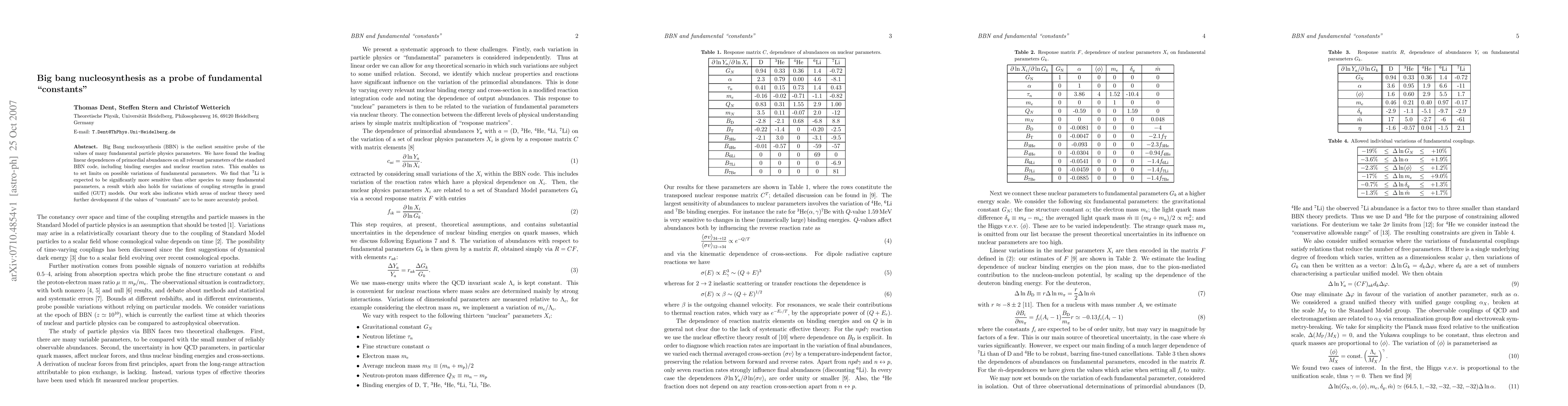 This paper investigates how Big Bang nucleosynthesis (BBN) can reveal variations in fundamental particle physics parameters, finding that lithium-7 (7Li) is particularly sensitive to these parameters. The study identifies areas in nuclear theory that require improvement to more accurately probe the values of these "constants."
