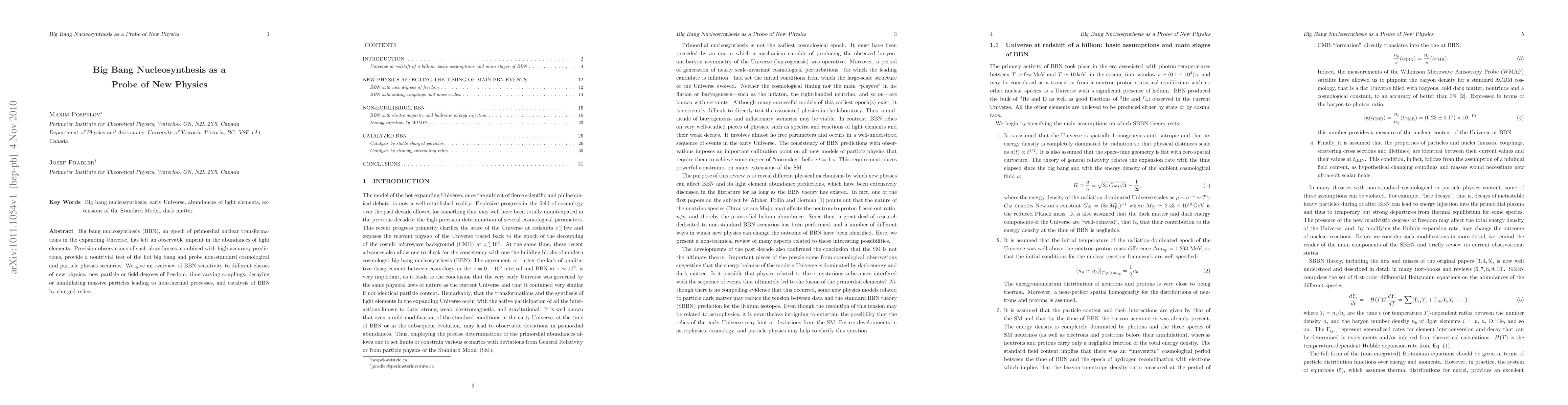 The paper provides an overview of how Big Bang Nucleosynthesis (BBN) can serve as a probe for new physics, examining sensitivity to various non-standard scenarios including new particle degrees of freedom, time-varying couplings, decaying or annihilating massive particles, and catalysis by charged relics.