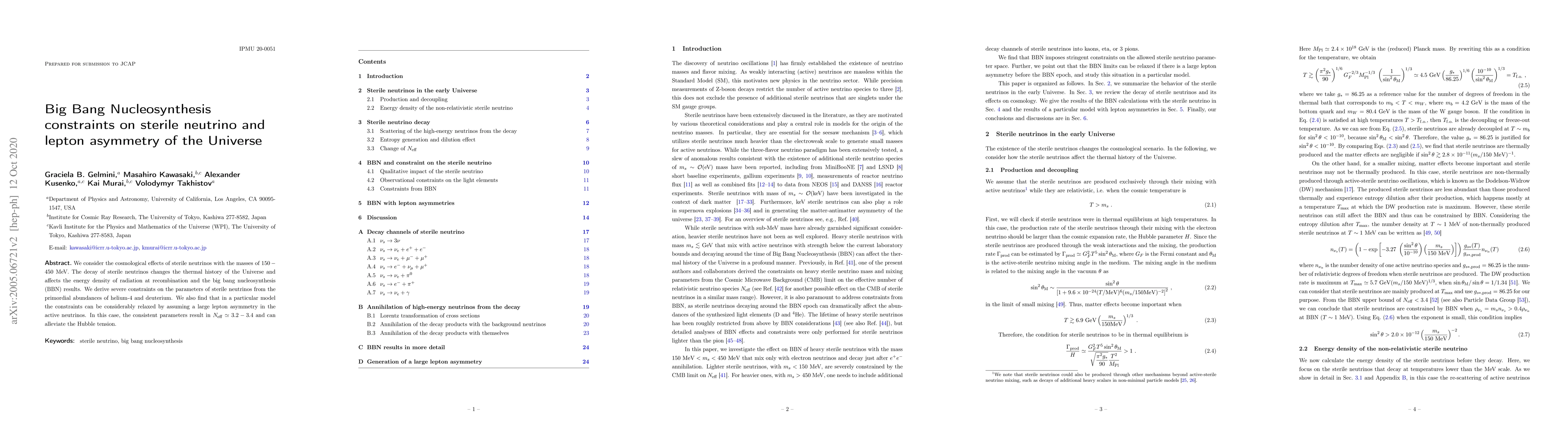 We consider the cosmological effects of sterile neutrinos with the masses of $150- 450$ MeV. The decay of sterile neutrinos changes the thermal history of the Universe and affects the energy density of radiation at the recombination and the big bang nucleosynthesis (BBN) results. We derive severe constraints on the parameters of sterile neutrinos from the primordial abundances of helium-4 and deuterium. We also find that in a particular model the constraints can be considerably relaxed by assuming a large lepton asymmetry in the active neutrinos. In this case, the consistent parameters result in $N_{\mathrm{eff}} \simeq 3.2- 3.4$ and can alleviate the Hubble tension.