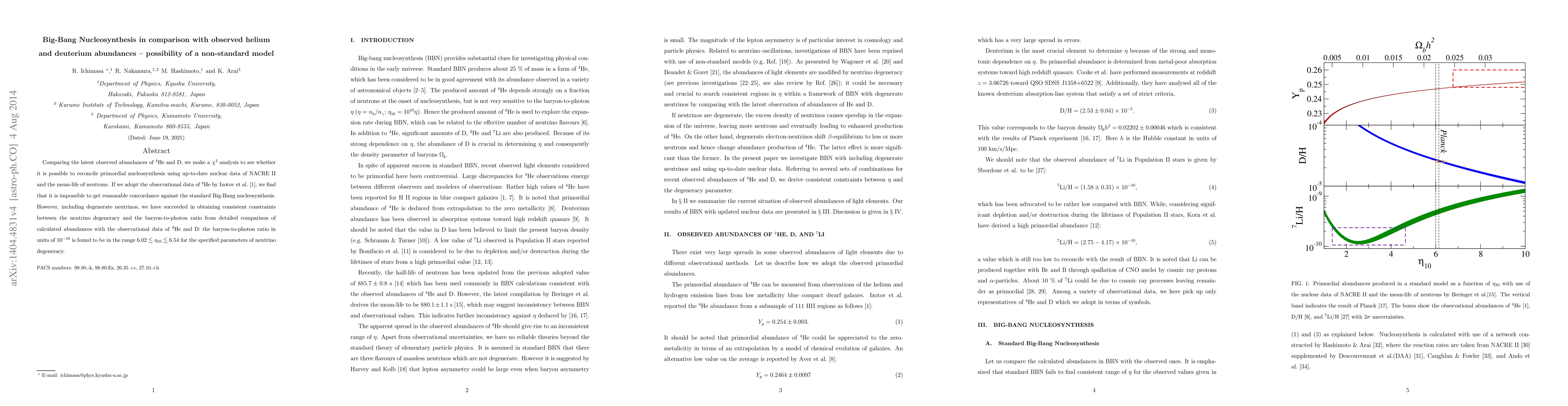 Comparing the latest observed abundances of 4He and D, we make a ?2 analysis to see whether it is possible to reconcile primordial nucleosynthesis using up-to-date nuclear data of NACRE II and the mean-life of neutrons. If we adopt the observational data of ${}^4_{}$He by Izotov et al., we find that it is impossible to get reasonable concordance against the standard Big-Bang nucleosynthesis. However, including degenerate neutrinos, we have succeeded in obtaining consistent constraints between the neutrino degeneracy and the baryon-to-photon ratio from detailed comparison of calculated abundances with the observational data of ${}^4_{}$He and D: the baryon-to-photon ratio in units of $10^{-10}$ is found to be in the range 6.02 < $\eta^{}_{10}$ < 6:54 for the specified parameters of neutrino degeneracy.