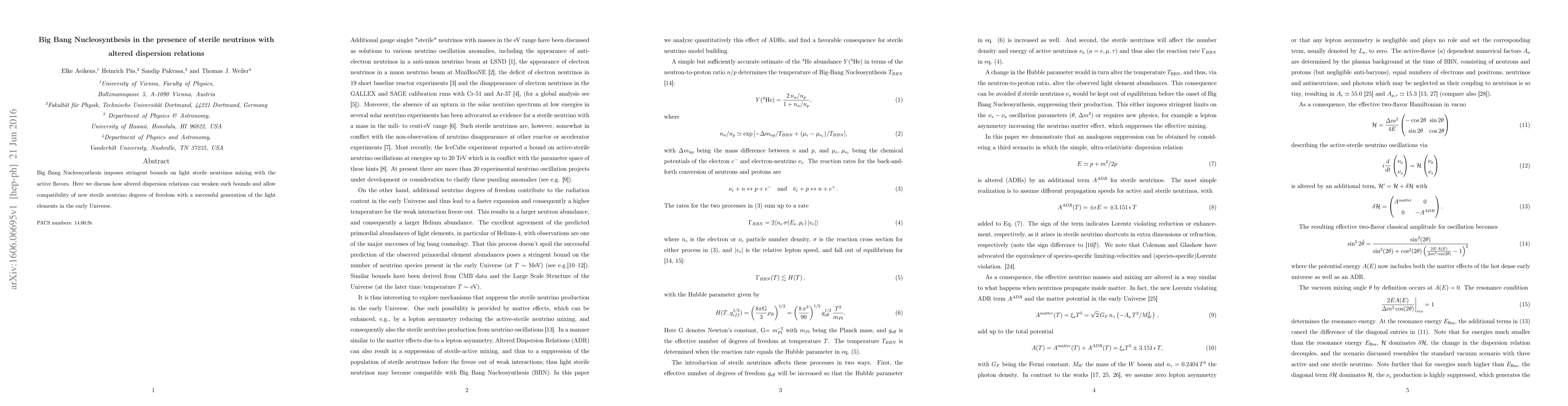 This paper explores how modified dispersion relations for sterile neutrinos can weaken constraints from Big Bang Nucleosynthesis, potentially allowing for new sterile neutrino degrees of freedom while still permitting the formation of light elements in the early Universe.