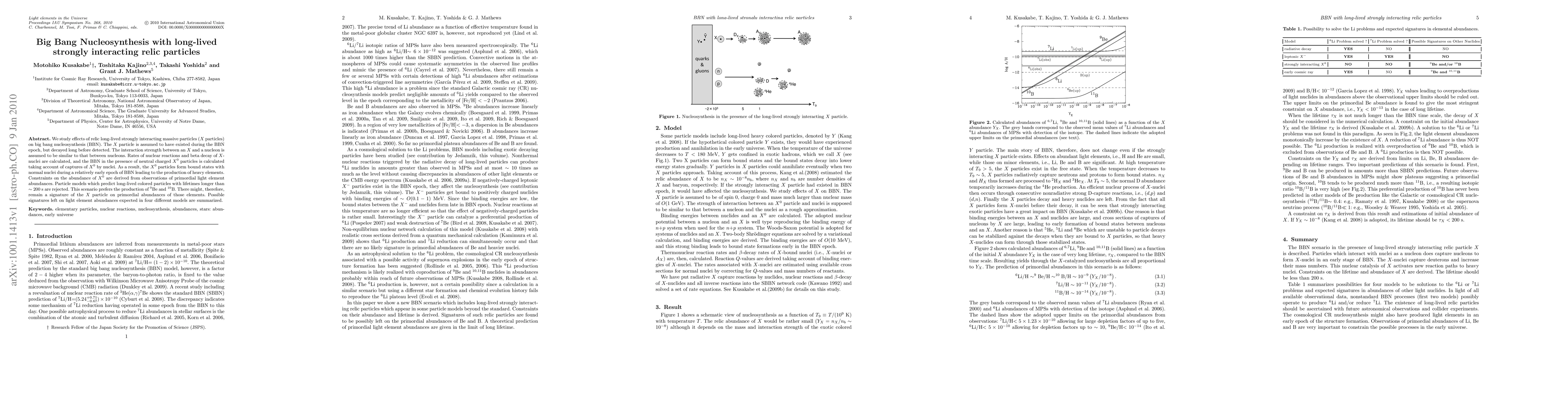 This paper investigates the impact of relic long-lived strongly interacting particles (X particles) on big bang nucleosynthesis (BBN) and finds that X^0 particles can form bound states with normal nuclei, influencing the production of heavy elements like 9Be and 10B. Constraints from primordial light element abundances suggest that particle models predicting long-lived colored particles with lifetimes longer than 200 seconds are unlikely.
