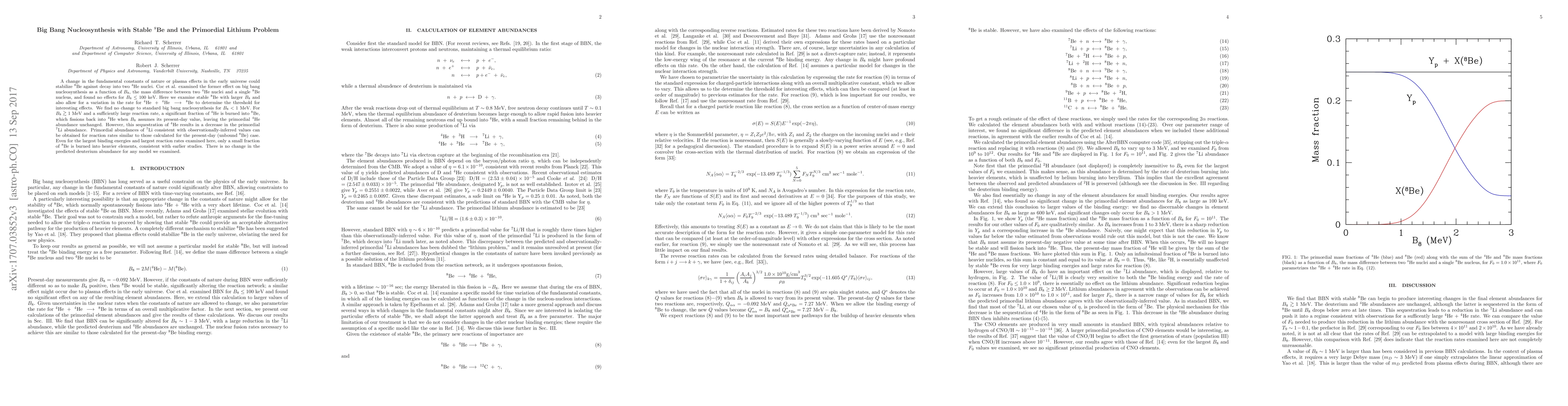 This paper explores the impact of stable $^8$Be on big bang nucleosynthesis, finding no significant changes for $B_8 < 1$ MeV. For $B_8 \gtrsim 1$ MeV, $^4$He is converted into $^8$Be, which later fissions back into $^4$He, but decreases primordial $^7$Li abundance, aligning with observational values if reaction rates are similar to current estimates.