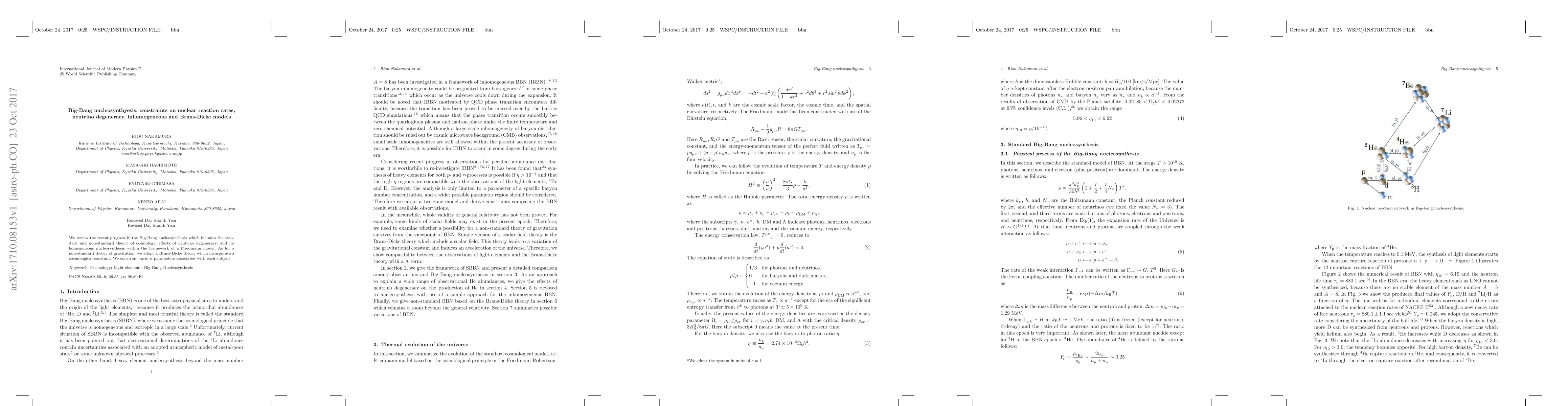 This paper reviews recent progress in Big-Bang nucleosynthesis theory, including constraints on nuclear reaction rates, neutrino degeneracy, and Brans-Dicke models of cosmology.