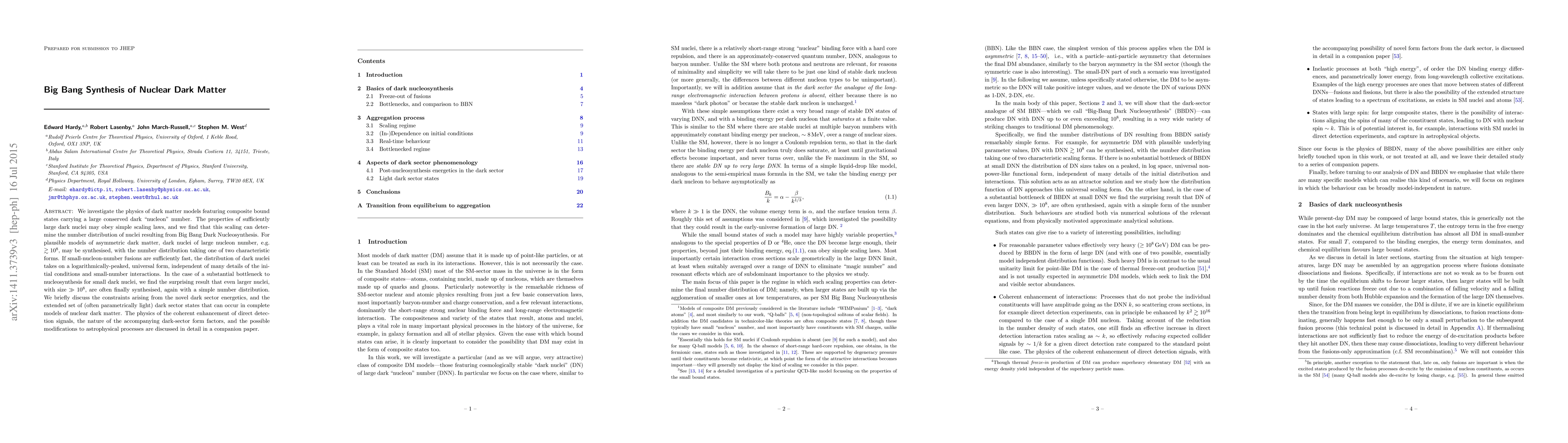 We investigate the physics of dark matter models featuring composite bound states carrying a large conserved dark "nucleon" number. The properties of sufficiently large dark nuclei may obey simple scaling laws, and we find that this scaling can determine the number distribution of nuclei resulting from Big Bang Dark Nucleosynthesis. For plausible models of asymmetric dark matter, dark nuclei of large nucleon number, e.g. > 10^8, may be synthesised, with the number distribution taking one of two characteristic forms. If small-nucleon-number fusions are sufficiently fast, the distribution of dark nuclei takes on a logarithmically-peaked, universal form, independent of many details of the initial conditions and small-number interactions. In the case of a substantial bottleneck to nucleosynthesis for small dark nuclei, we find the surprising result that even larger nuclei, with size >> 10^8, are often finally synthesised, again with a simple number distribution. We briefly discuss the constraints arising from the novel dark sector energetics, and the extended set of (often parametrically light) dark sector states that can occur in complete models of nuclear dark matter. The physics of the coherent enhancement of direct detection signals, the nature of the accompanying dark-sector form factors, and the possible modifications to astrophysical processes are discussed in detail in a companion paper.