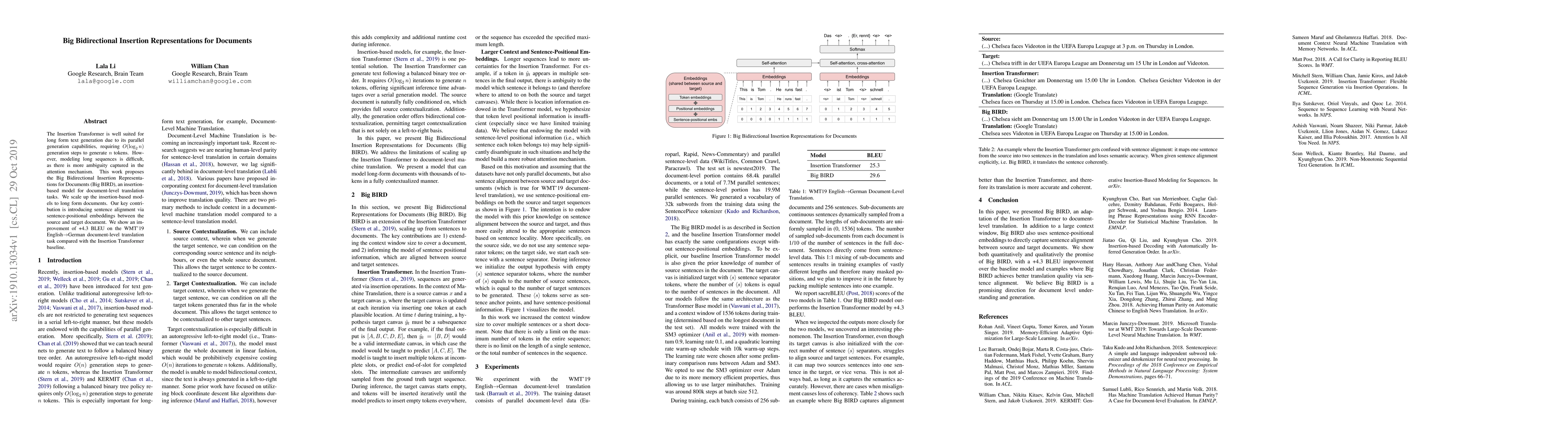 The Insertion Transformer is well suited for long form text generation due to its parallel generation capabilities, requiring $O(\log_2 n)$ generation steps to generate $n$ tokens. However, modeling long sequences is difficult, as there is more ambiguity captured in the attention mechanism. This work proposes the Big Bidirectional Insertion Representations for Documents (Big BIRD), an insertion-based model for document-level translation tasks. We scale up the insertion-based models to long form documents. Our key contribution is introducing sentence alignment via sentence-positional embeddings between the source and target document. We show an improvement of +4.3 BLEU on the WMT'19 English$\rightarrow$German document-level translation task compared with the Insertion Transformer baseline.