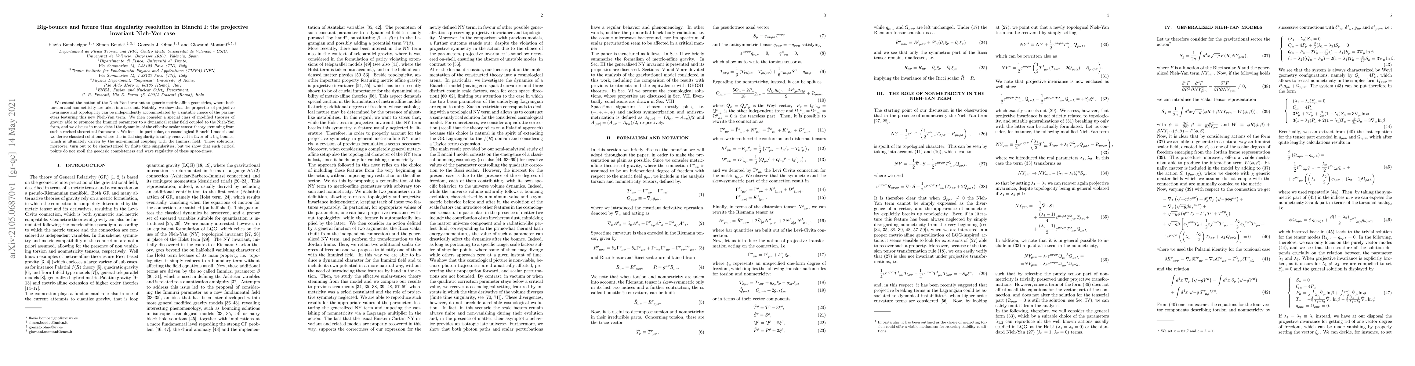 This paper extends the Nieh-Yan invariant to metric-affine geometries, demonstrating that projective invariance and topologicity can be independently managed. It proposes a modified gravity theory that resolves initial singularities in Bianchi I cosmological models via a big-bounce, driven by a non-minimal coupling with the Immirzi field, while maintaining geodesic completeness and wave regularity despite finite time singularities.