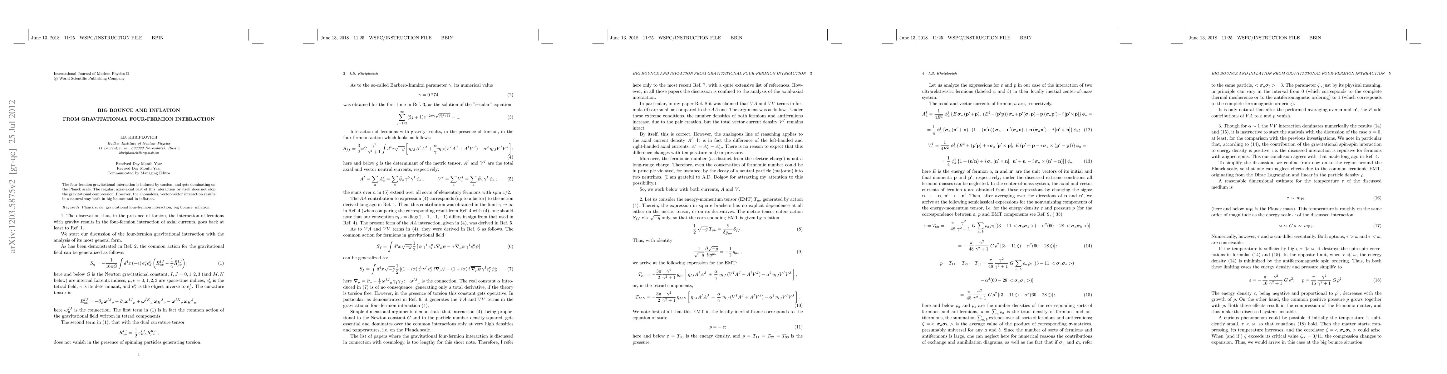 Summary: The paper explores how a four-fermion gravitational interaction, driven by torsion, leads to a big bounce and subsequent inflation, countering gravitational compression through its anomalous vector-vector component. This mechanism operates naturally on the Planck scale.