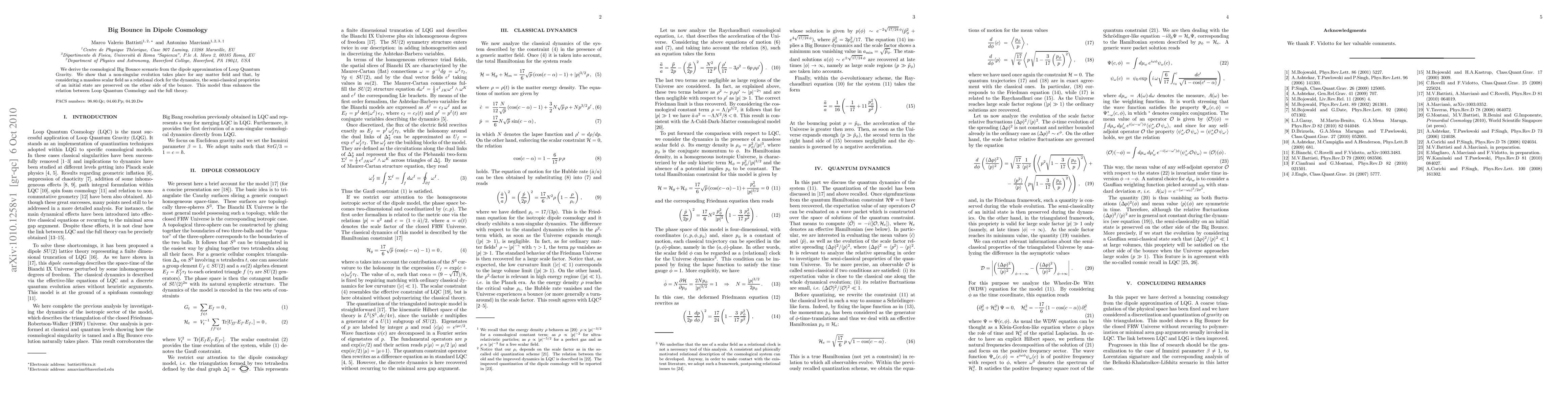 We derive the cosmological Big Bounce scenario from the dipole approximation of Loop Quantum Gravity. We show that a non-singular evolution takes place for any matter field and that, by considering a massless scalar field as a relational clock for the dynamics, the semi-classical proprieties of an initial state are preserved on the other side of the bounce. This model thus enhances the relation between Loop Quantum Cosmology and the full theory.
