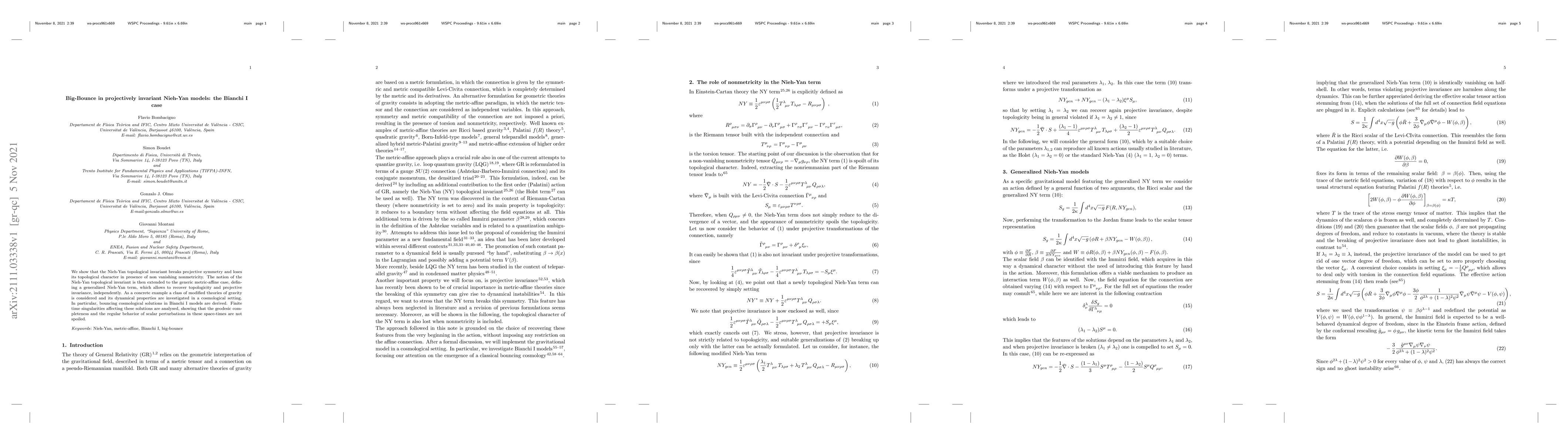 We show that the Nieh-Yan topological invariant breaks projective symmetry and loses its topological character in presence of non vanishing nonmetricity. The notion of the Nieh-Yan topological invariant is then extended to the generic metric-affine case, defining a generalized Nieh-Yan term, which allows to recover topologicity and projective invariance, independently. As a concrete example a class of modified theories of gravity is considered and its dynamical properties are investigated in a cosmological setting. In particular, bouncing cosmological solutions in Bianchi I models are derived. Finite time singularities affecting these solutions are analysed, showing that the geodesic completeness and the regular behavior of scalar perturbations in these space-times are not spoiled.