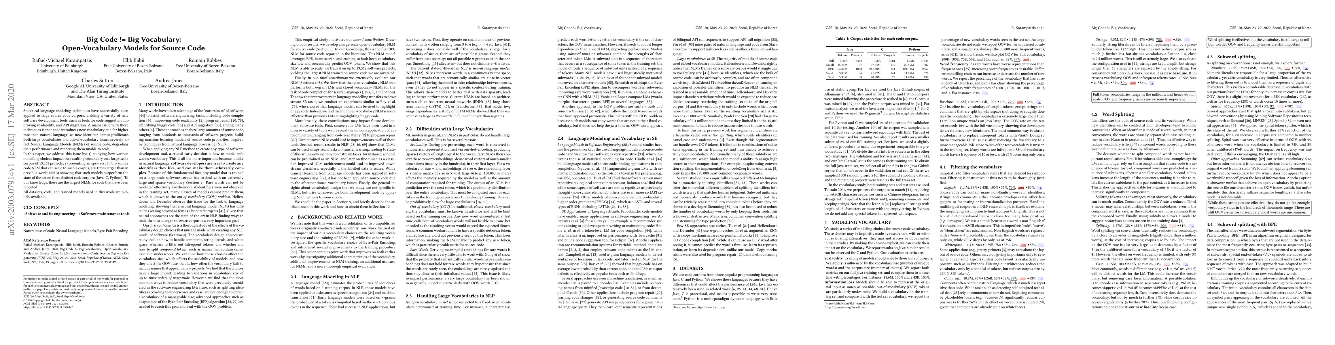 This paper investigates the challenges of large vocabularies in source code and proposes an open vocabulary neural language model that scales to a 13,362-project corpus, outperforming previous models on Java, C, and Python code corpora. The authors make their datasets, code, and models publicly available.